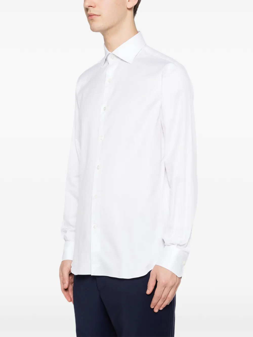 Белый, застежка на пуговицы, длинные рукава, манжеты на пуговицах, воротник-стойка, закругленный подол