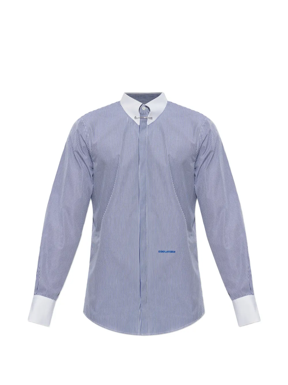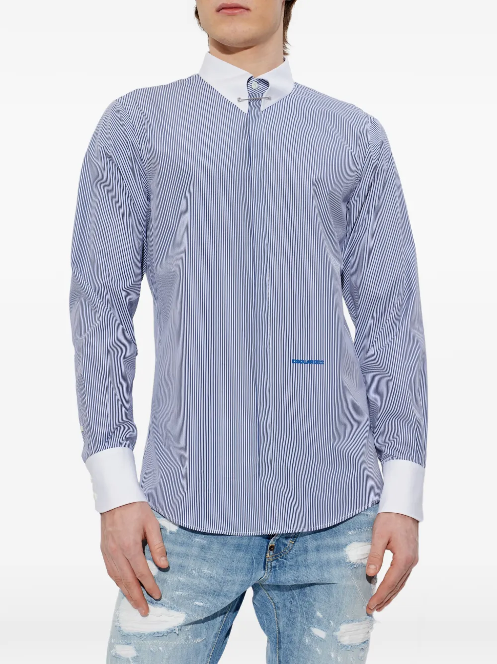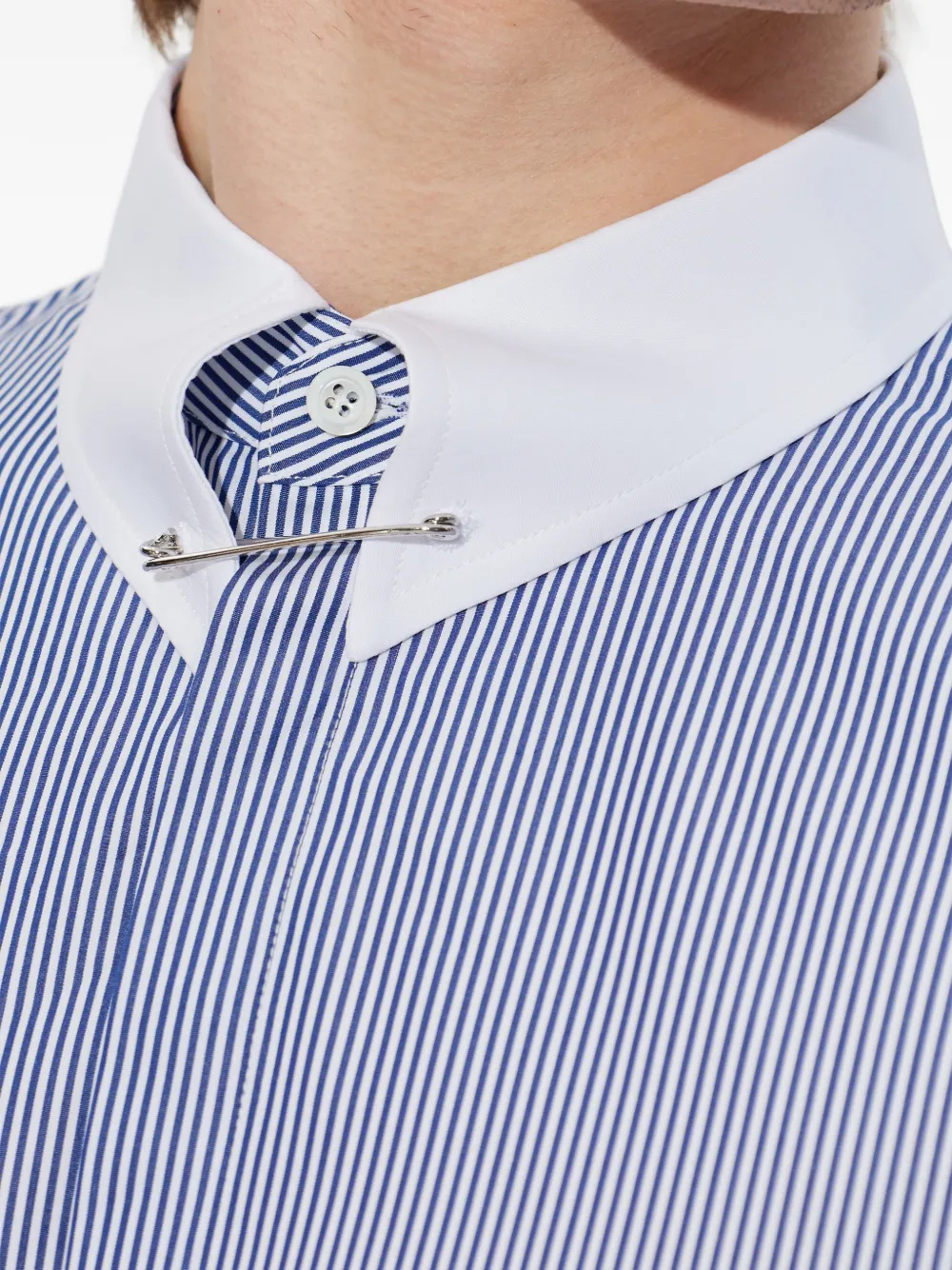 Белая и синяя полосатая рубашка с застежкой на пуговицы, длинными рукавами и декоративной булавкой