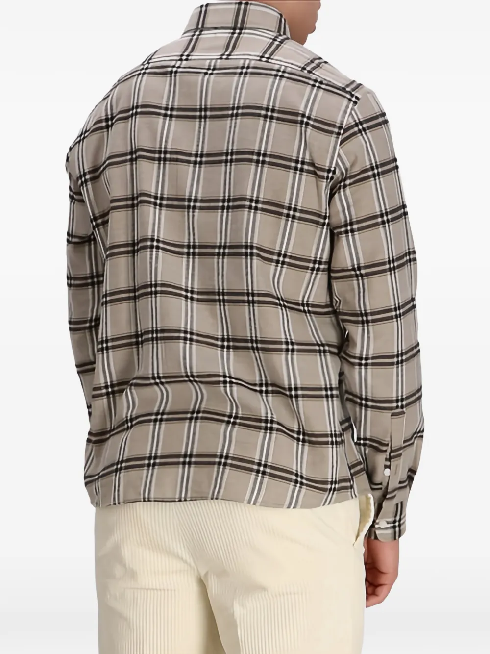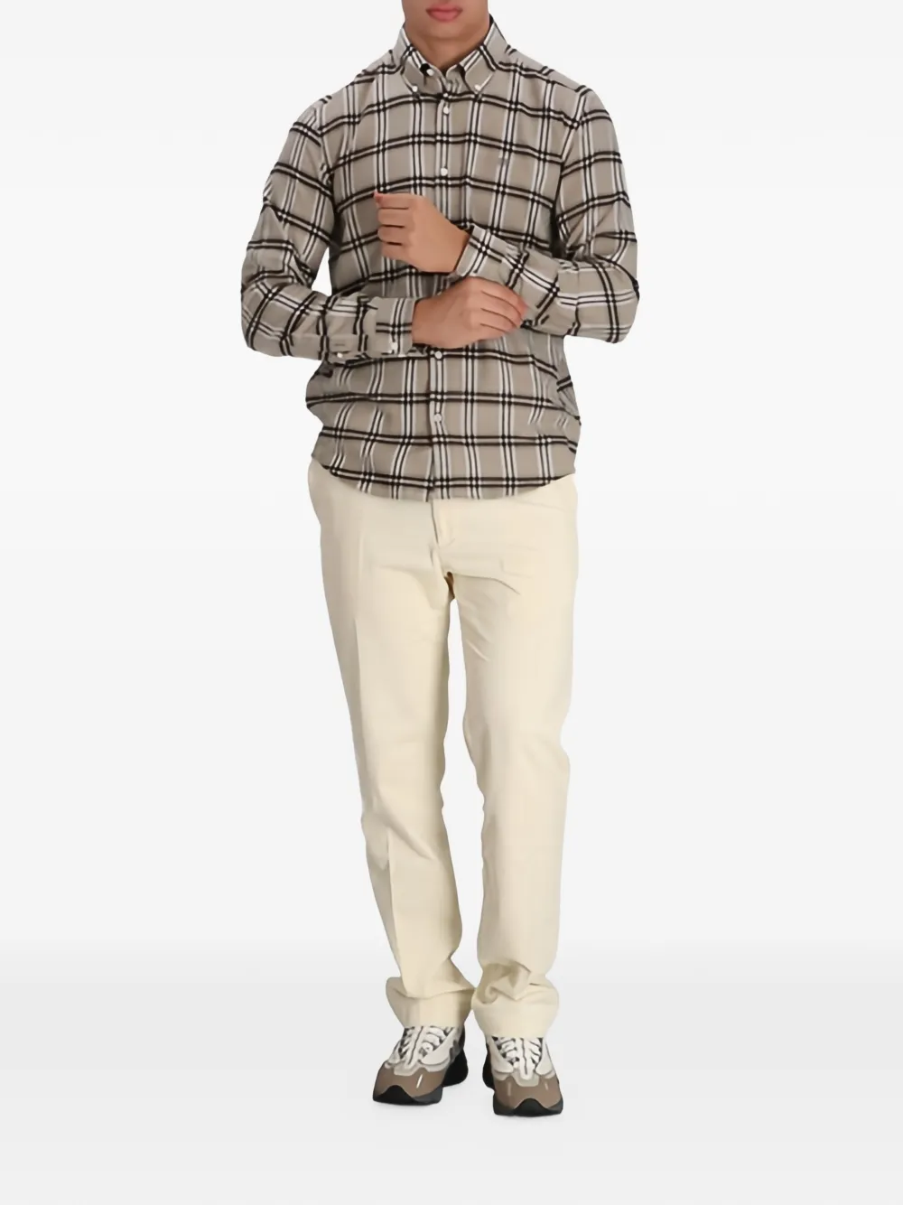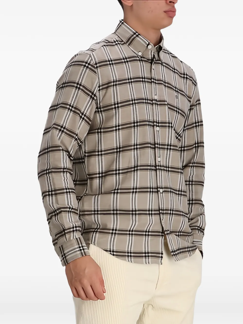Бежевый клетчатый рисунок, застежка на пуговицы, длинные рукава, воротник на пуговицах, хлопок