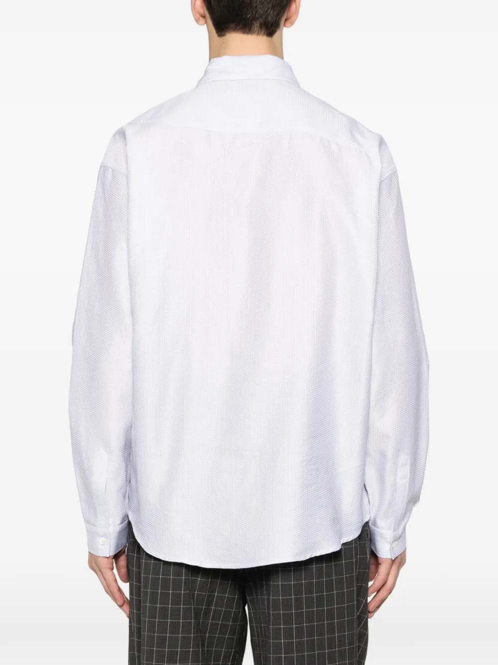 Белый с пунктирным полосатым узором, нагрудный карман, длинные рукава, застежка на пуговицы