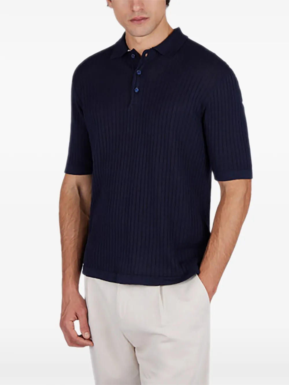 Синяя рубашка из рубчатого трикотажа с короткими рукавами и застежкой на пуговицы спереди