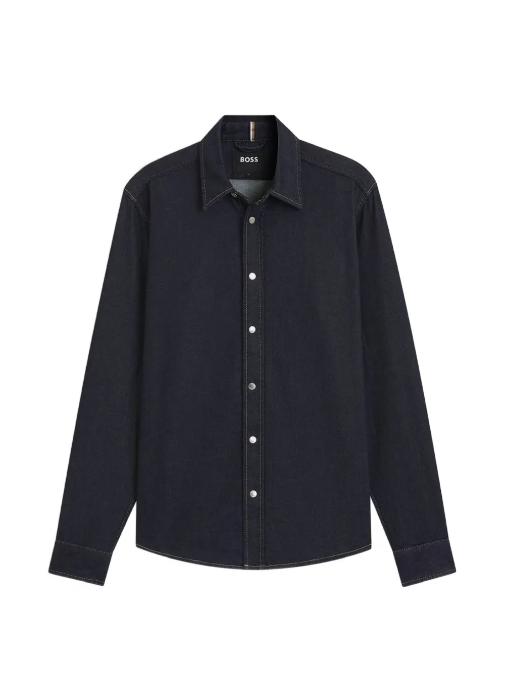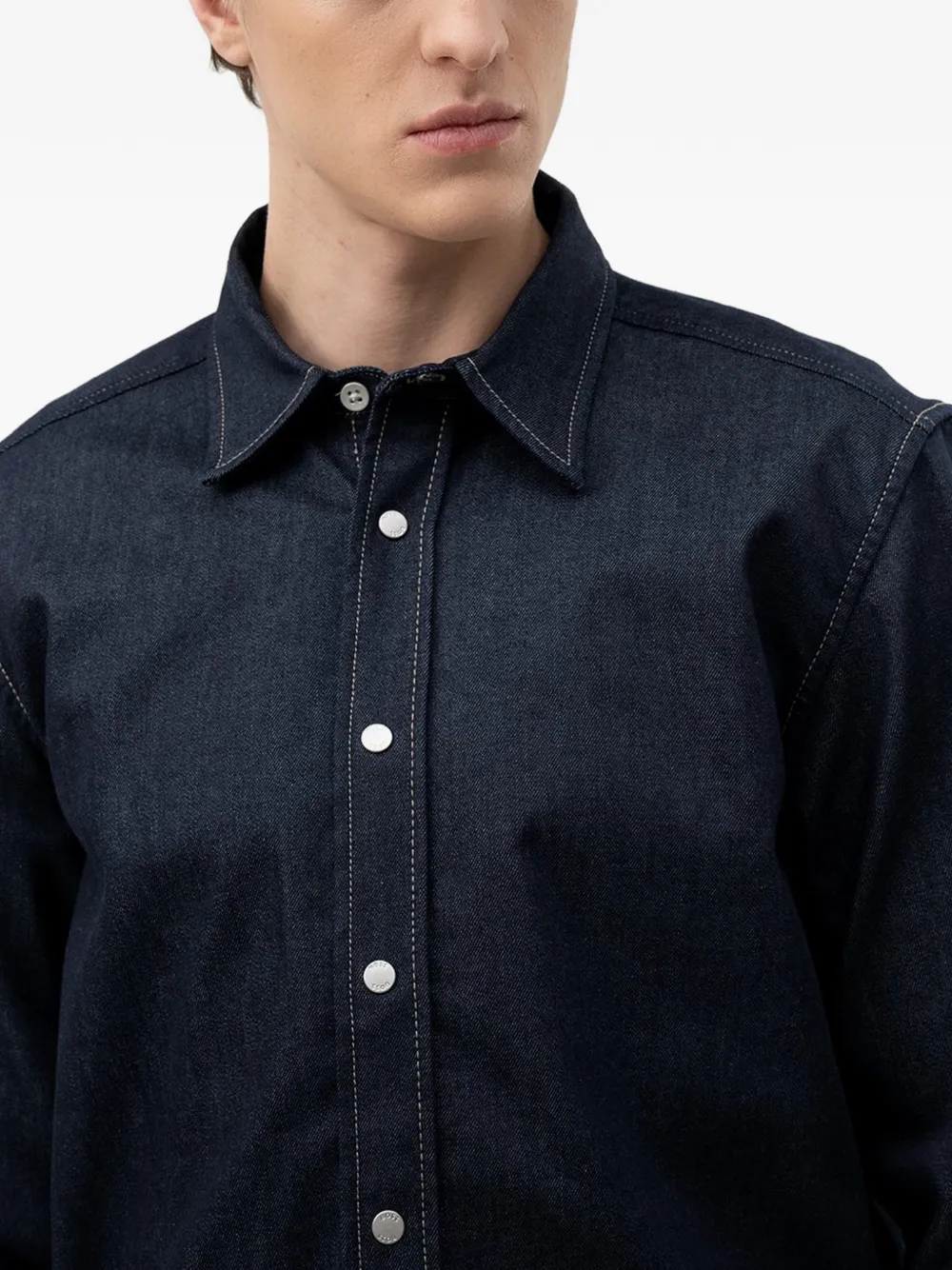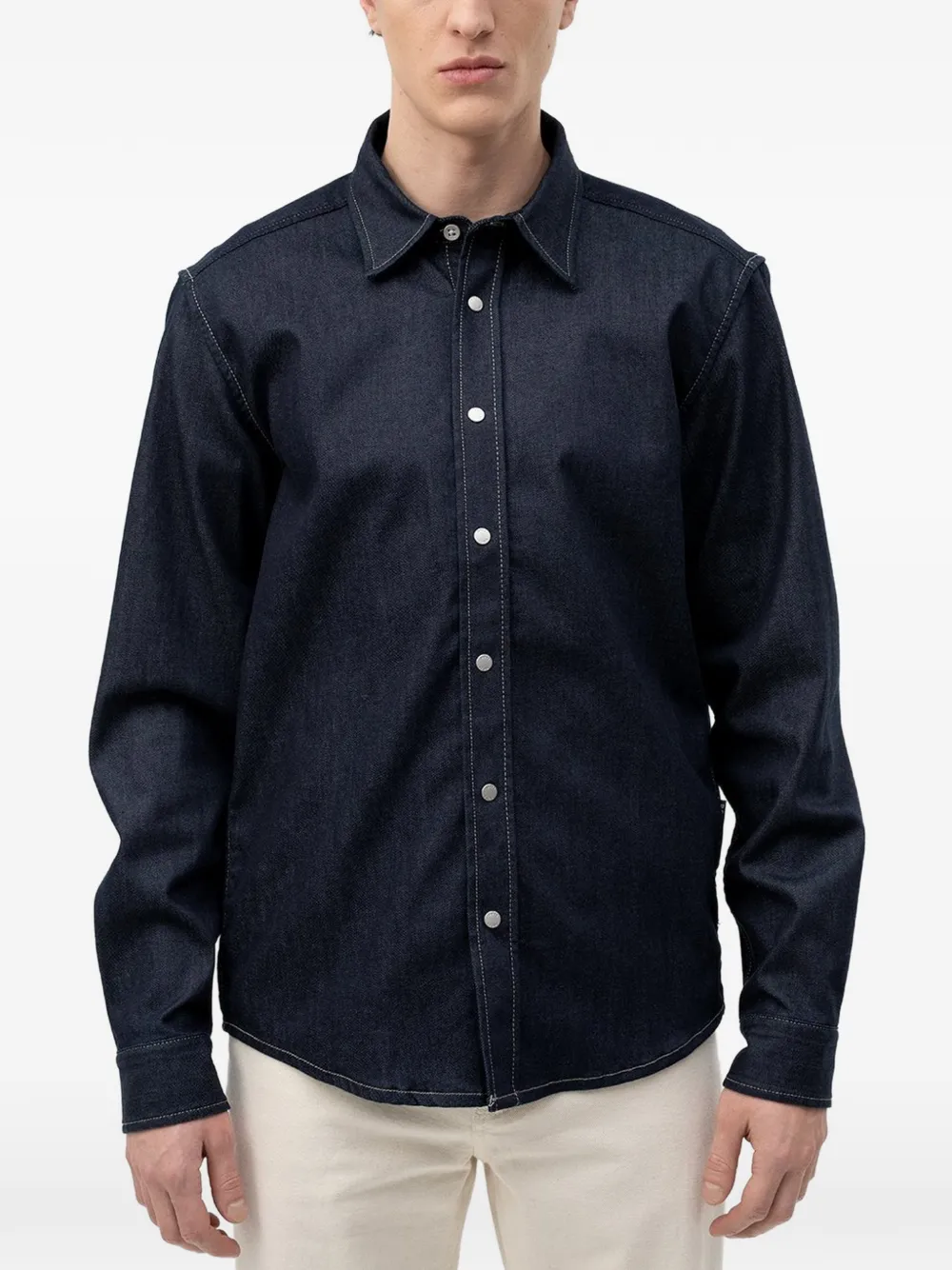 Темно-синяя рубашка с длинными рукавами, застежкой на пуговицы и контрастной строчкой