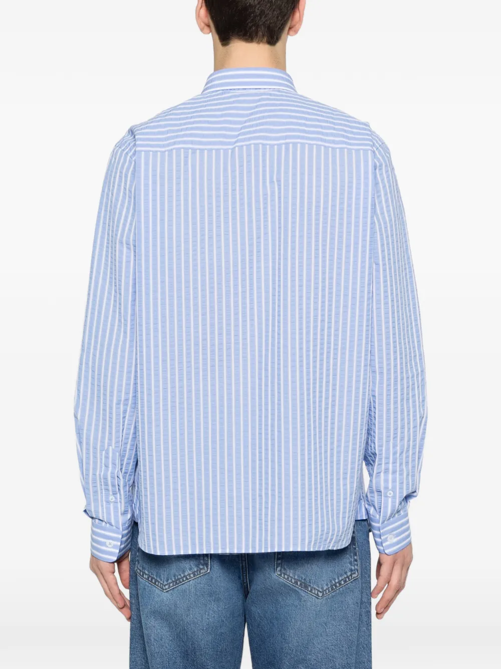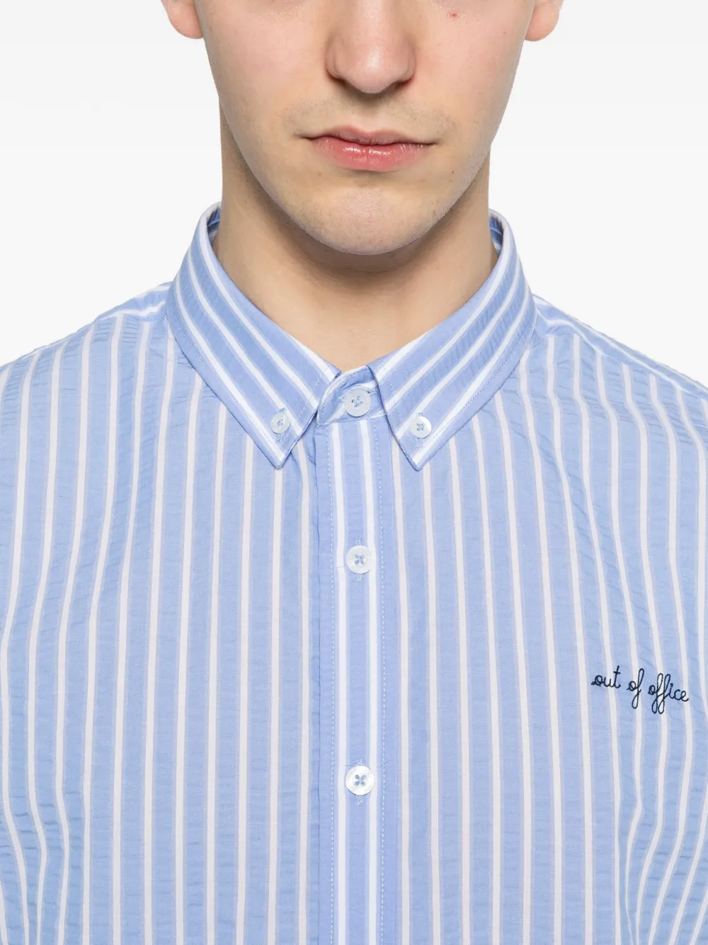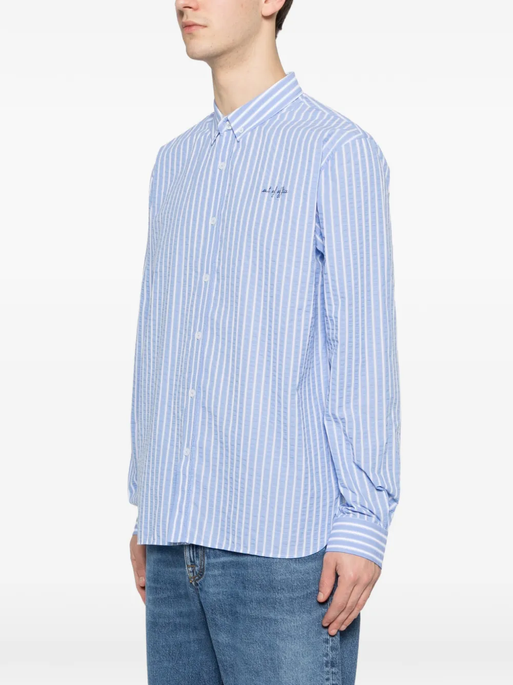 Синяя рубашка в полоску, застегивается на пуговицы, длинные рукава, вышивка на груди