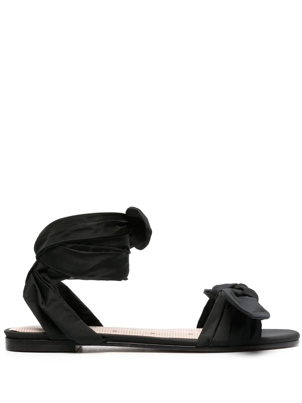 Черный, бант, стелька с логотипом, закругленный носок, открытый носок, завязка на щиколотке и плоская подошва.