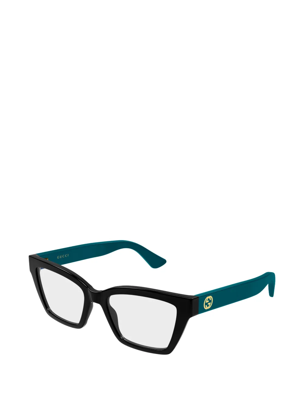 Черный, зеленый, золотистый логотип, оправа «кошачий глаз», внутренняя часть оправы бирюзового цвета, бирюзовые дужки, носоупоры. Все очки на FARFETCH продаются без диоптрий. В комплекте идет защитный футляр.