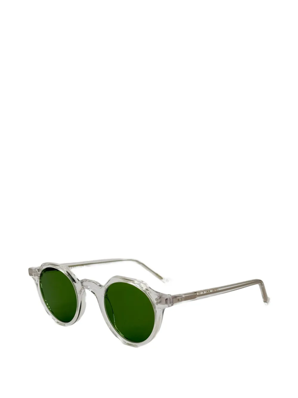 Прозрачная круглая оправа, тонированные линзы, носоупоры. Очки поставляются в защитном футляре.