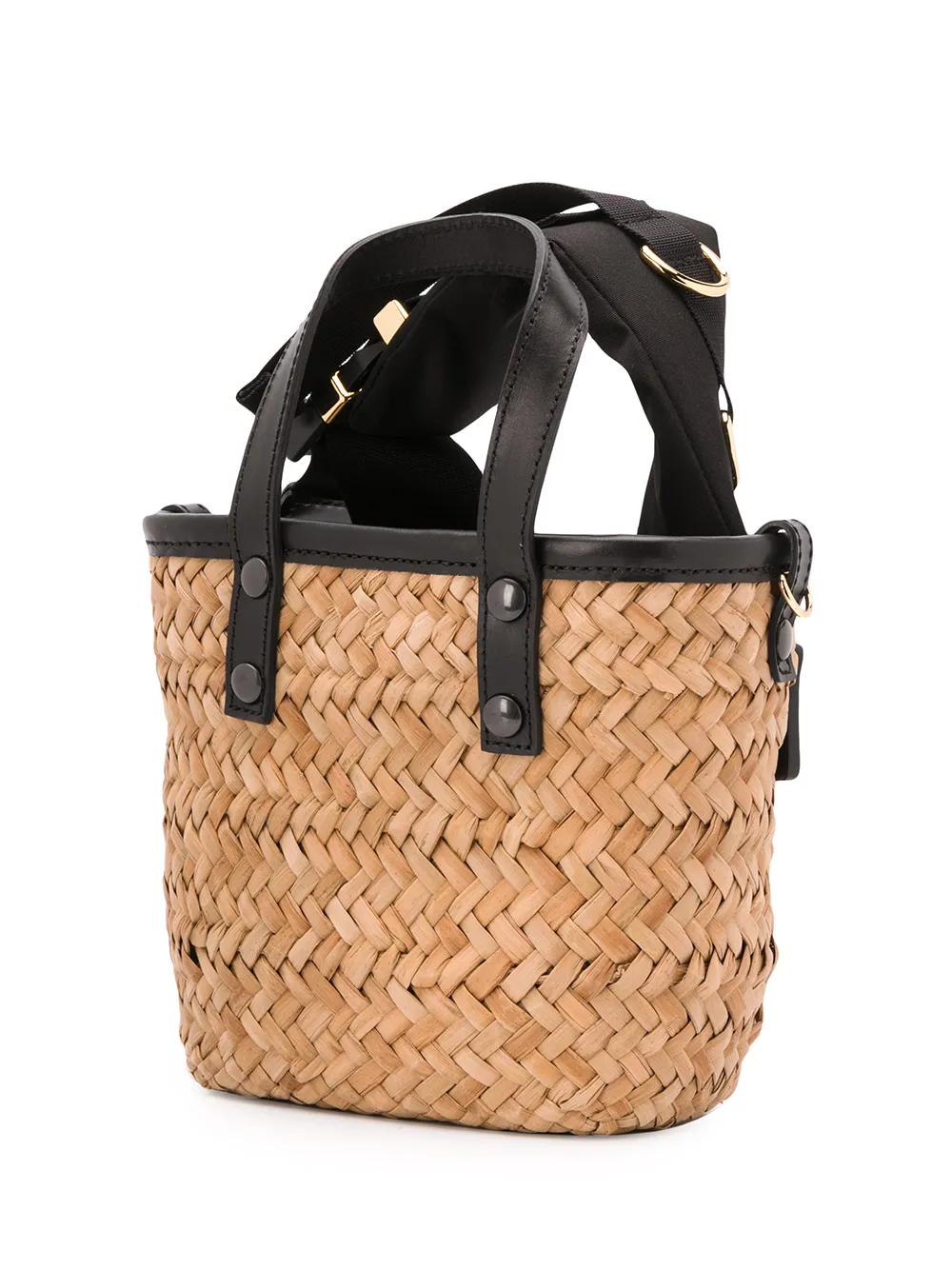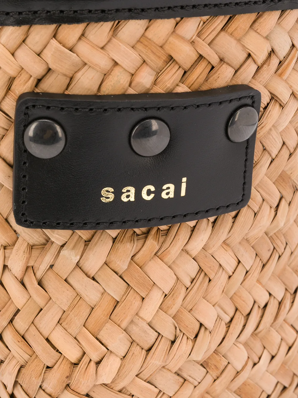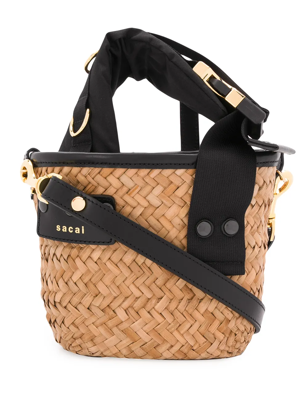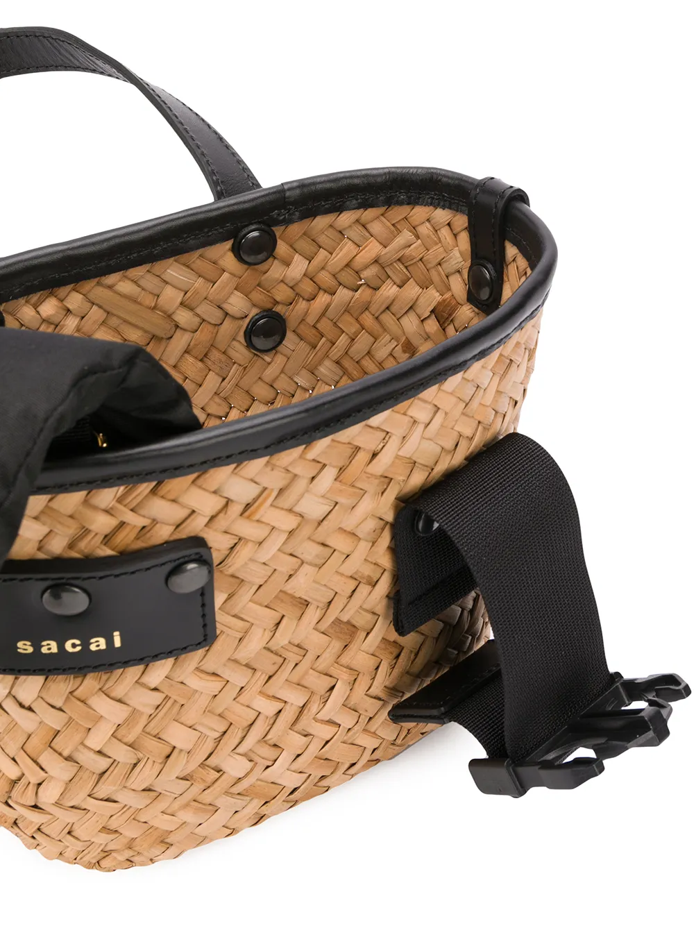 Мини-сумка Paglia от Sacai. Кожаная отделка, закругленные ручки, съемная лямка на плечо, пряжка с логотипом спереди, главный внутренний отдел и портфельная застежка.