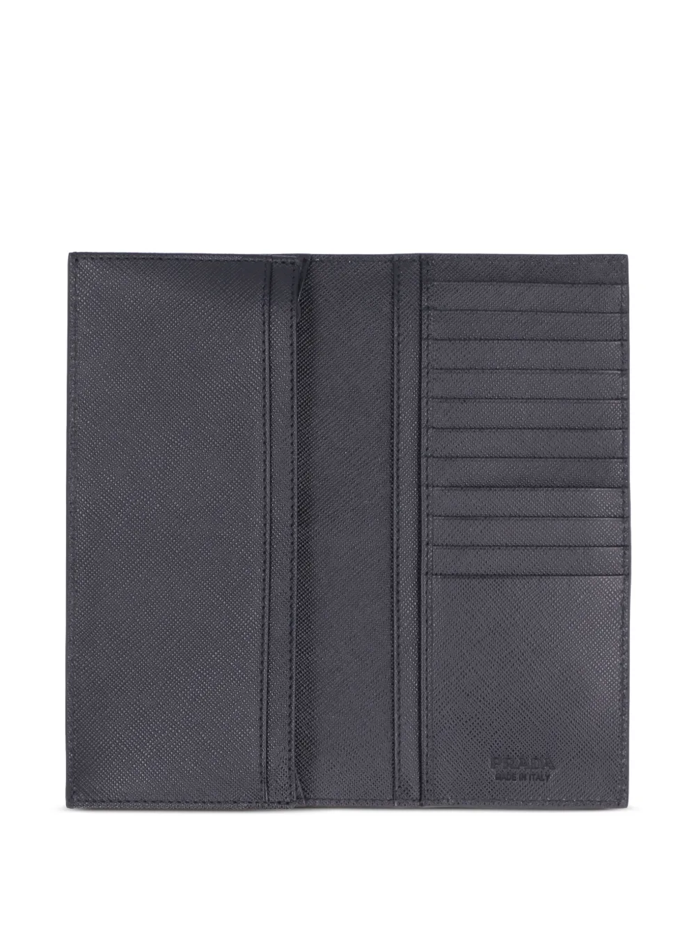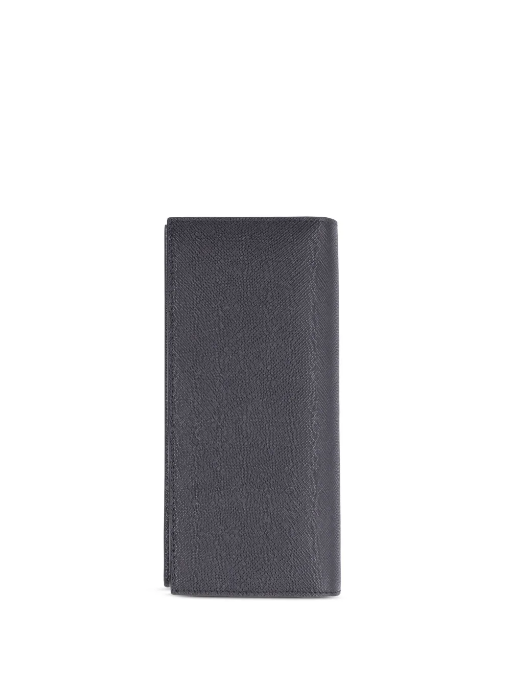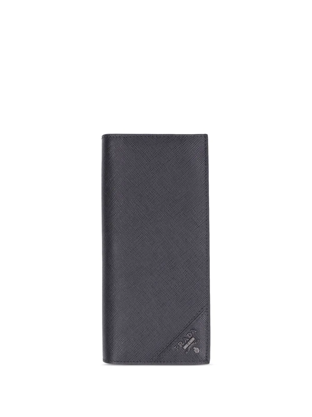 Черная папка для документов из сафьяновой телячьей кожи от Prada. Несколько отделений для банкнот, отсек для купюр, бляшка с логотипом в углу, узкая модель.