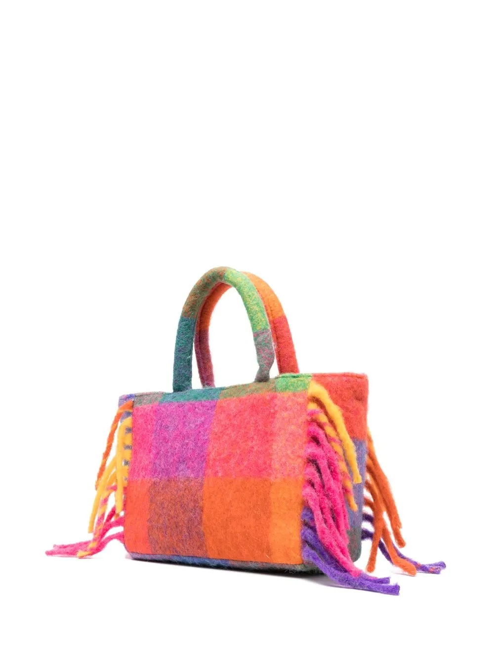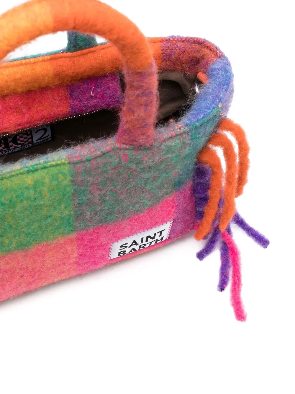 Клетчатый узор, бахрома, нашивка с логотипом спереди, застежка на молнии сверху, основное отделение, нашивка с логотипом внутри и две верхние ручки.