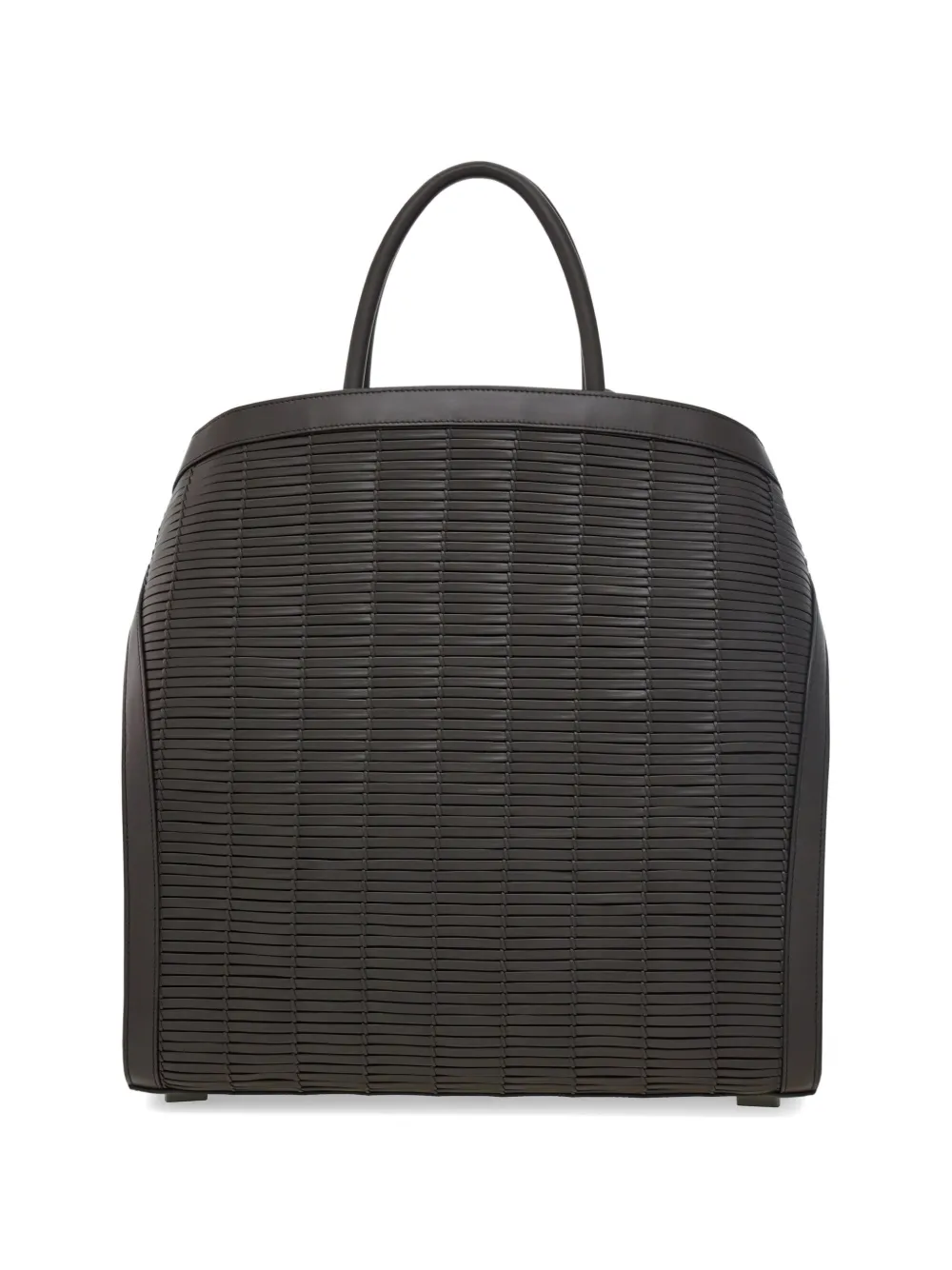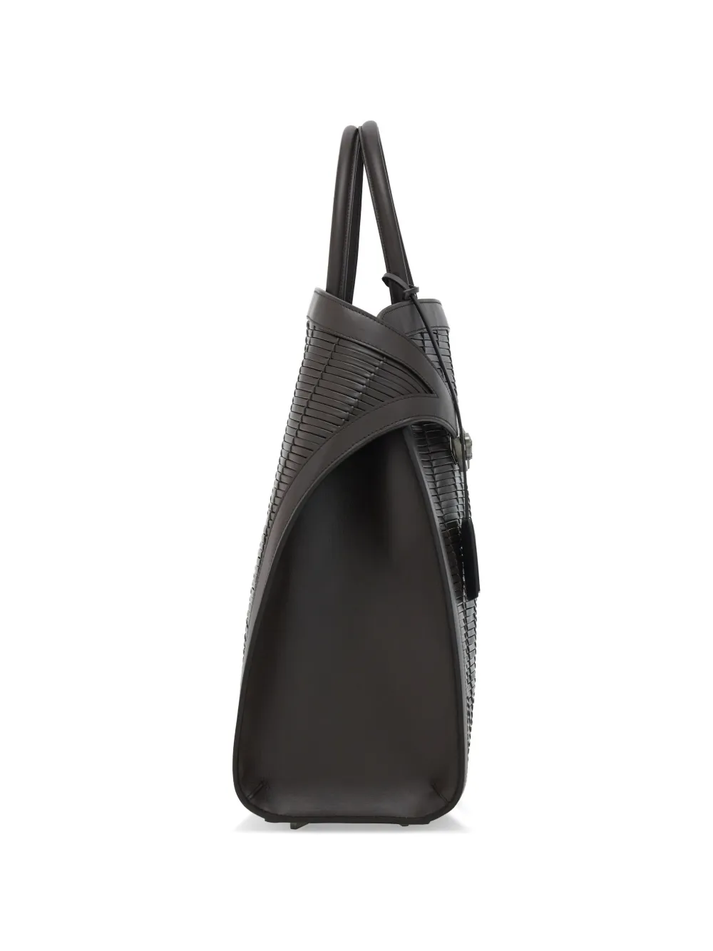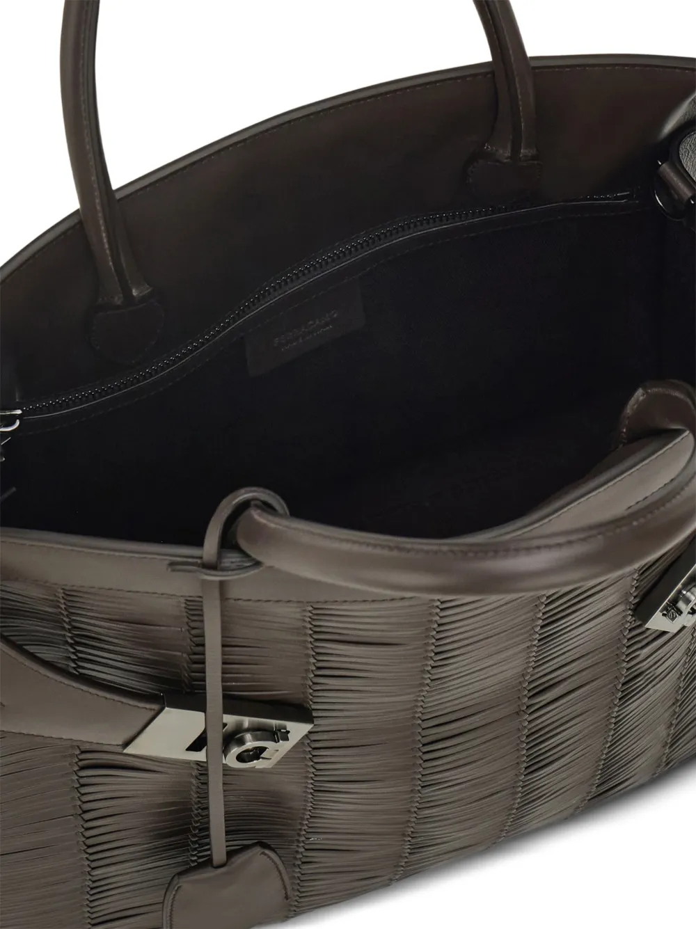 Темно-коричневая телячья кожа, плетеные детали, пряжки с рутениевым покрытием, внутренняя карман-на-молнии, брелок для ключей