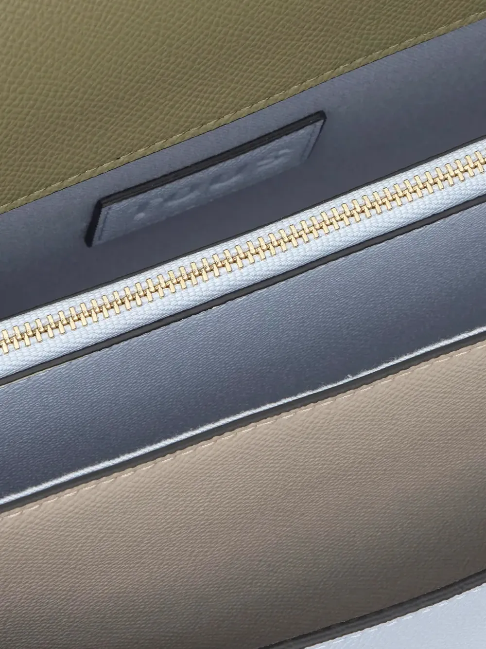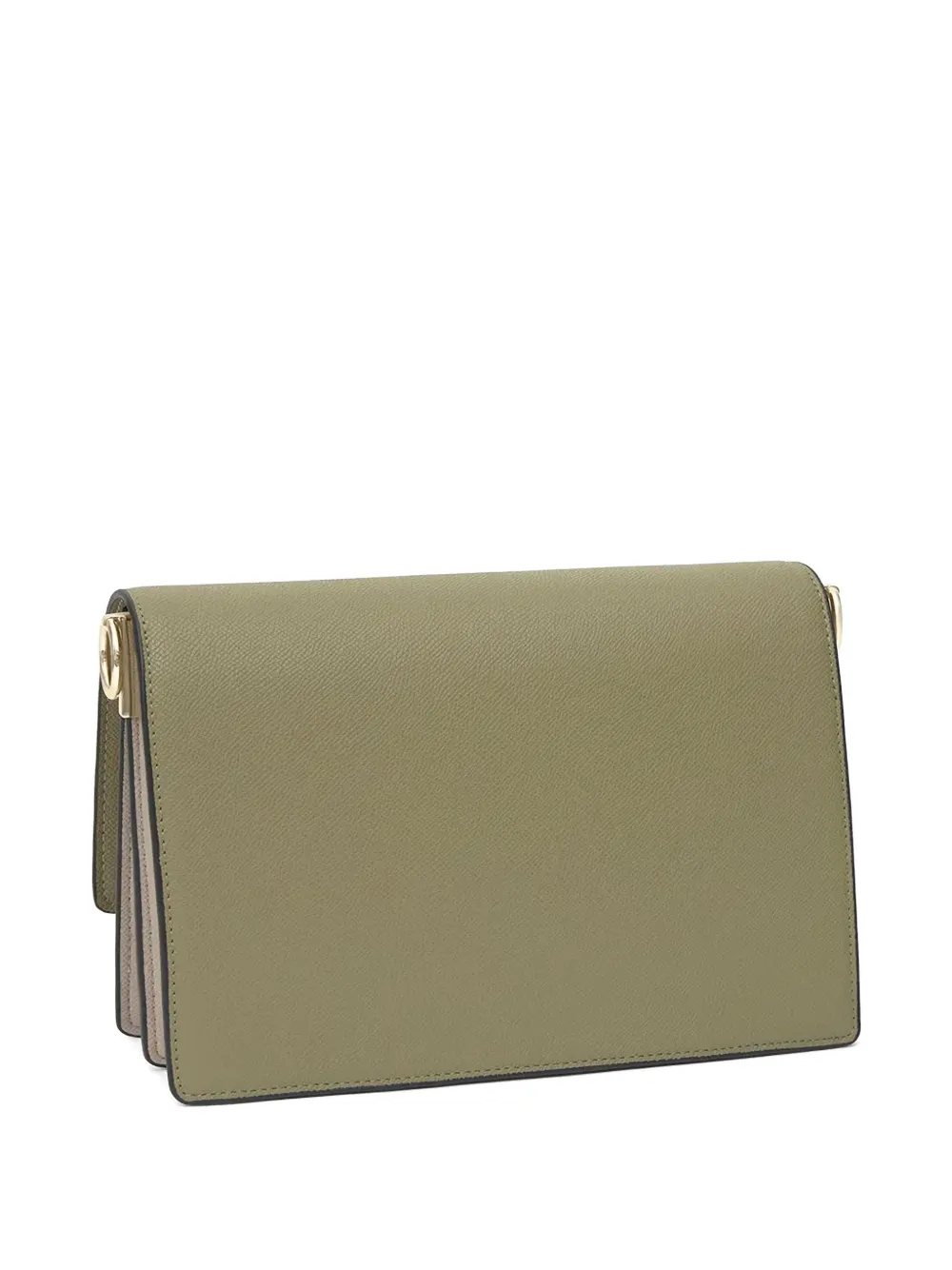 Зеленый цвет, тисненые детали, съемный ремень, верхняя застежка на молнию, фурнитура золотистого цвета, многослойный дизайн