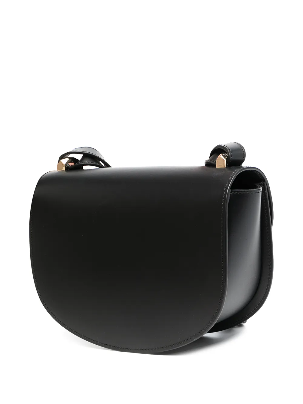 Золотистый логотип, застежка с клапаном спереди, закругленная форма и регулируемый ремень на плечо. Цвет: черный.