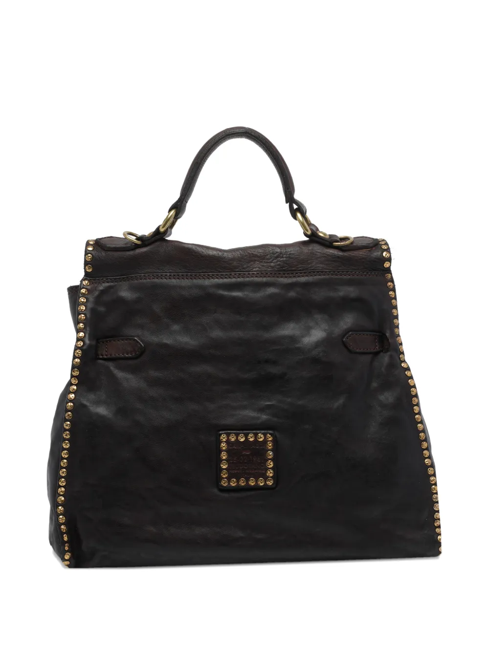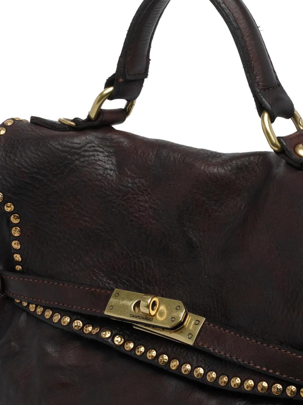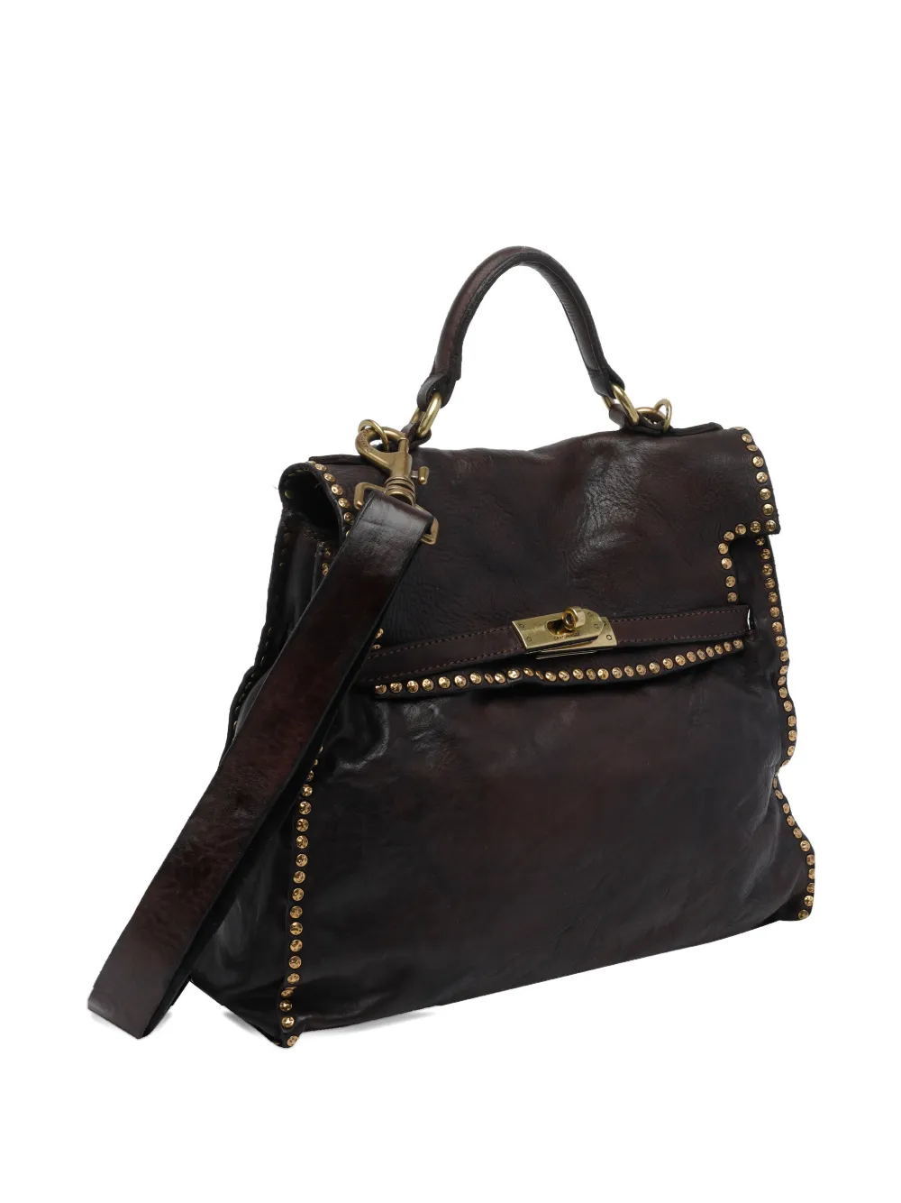 Коричневый цвет, золотистые заклепки, верхняя ручка, регулируемый плечевой ремень, застежка-замок