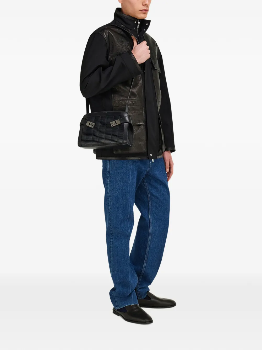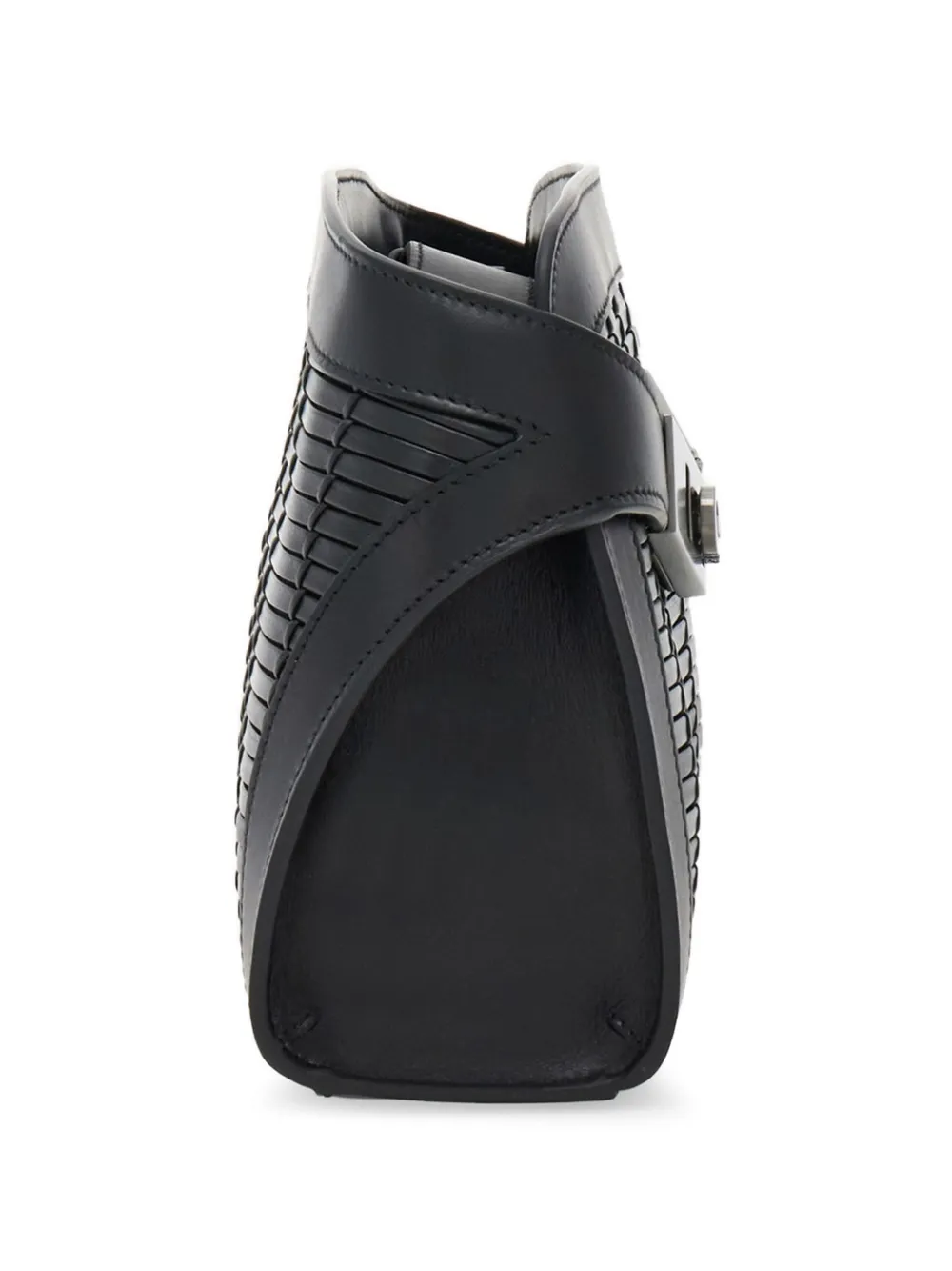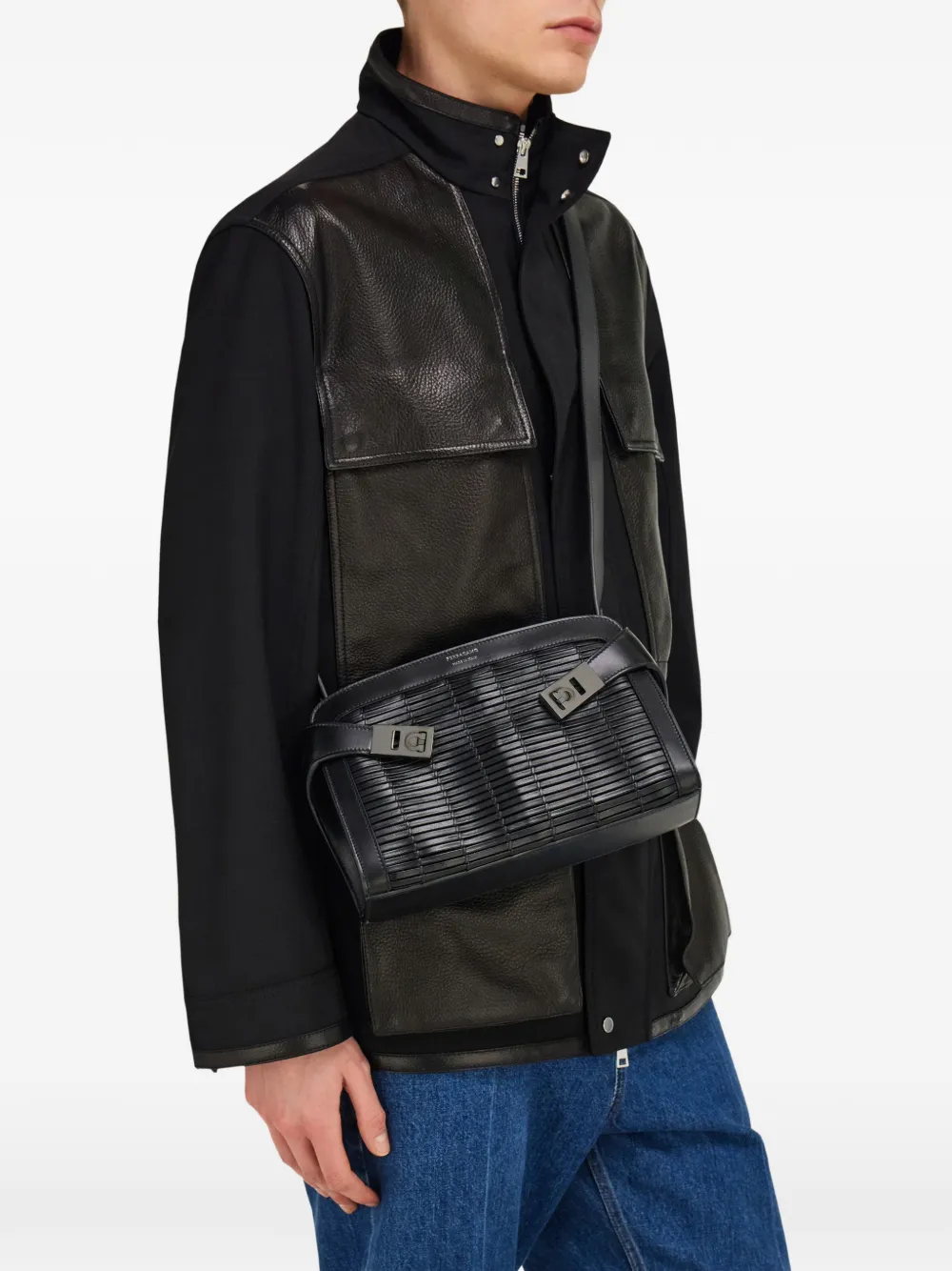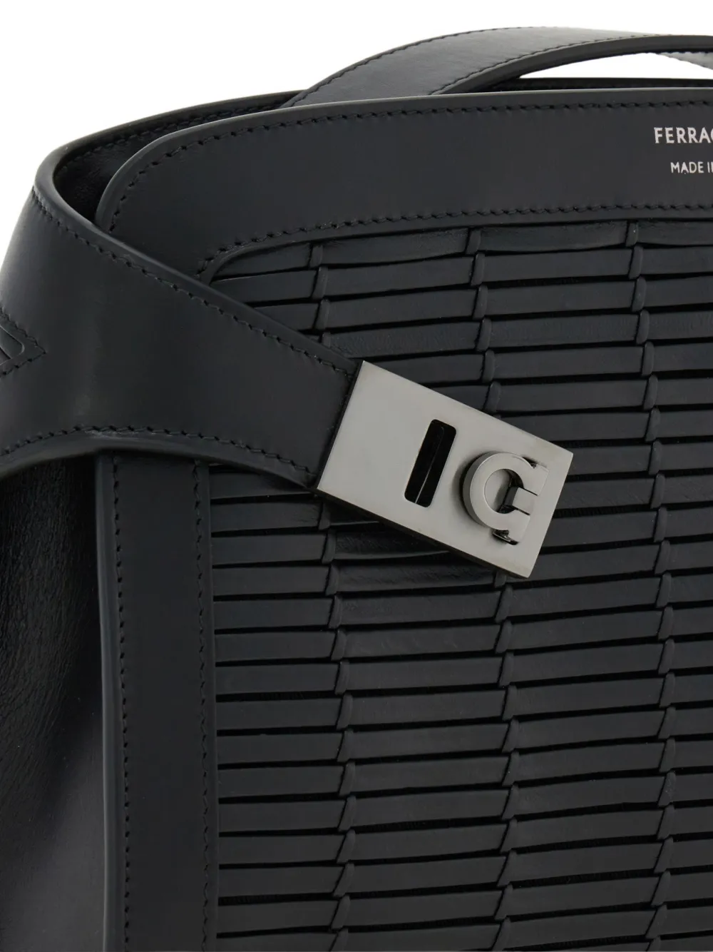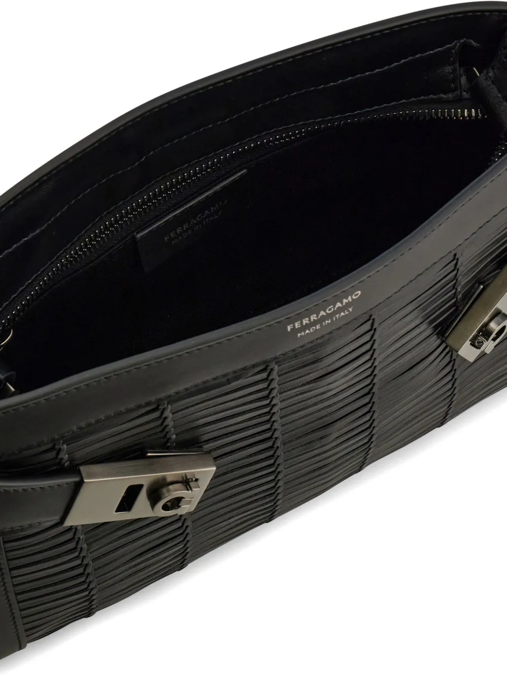 Черная телячья кожа, плетеный декор, пряжка Gancini, регулируемый ремень, застежка-молния сверху