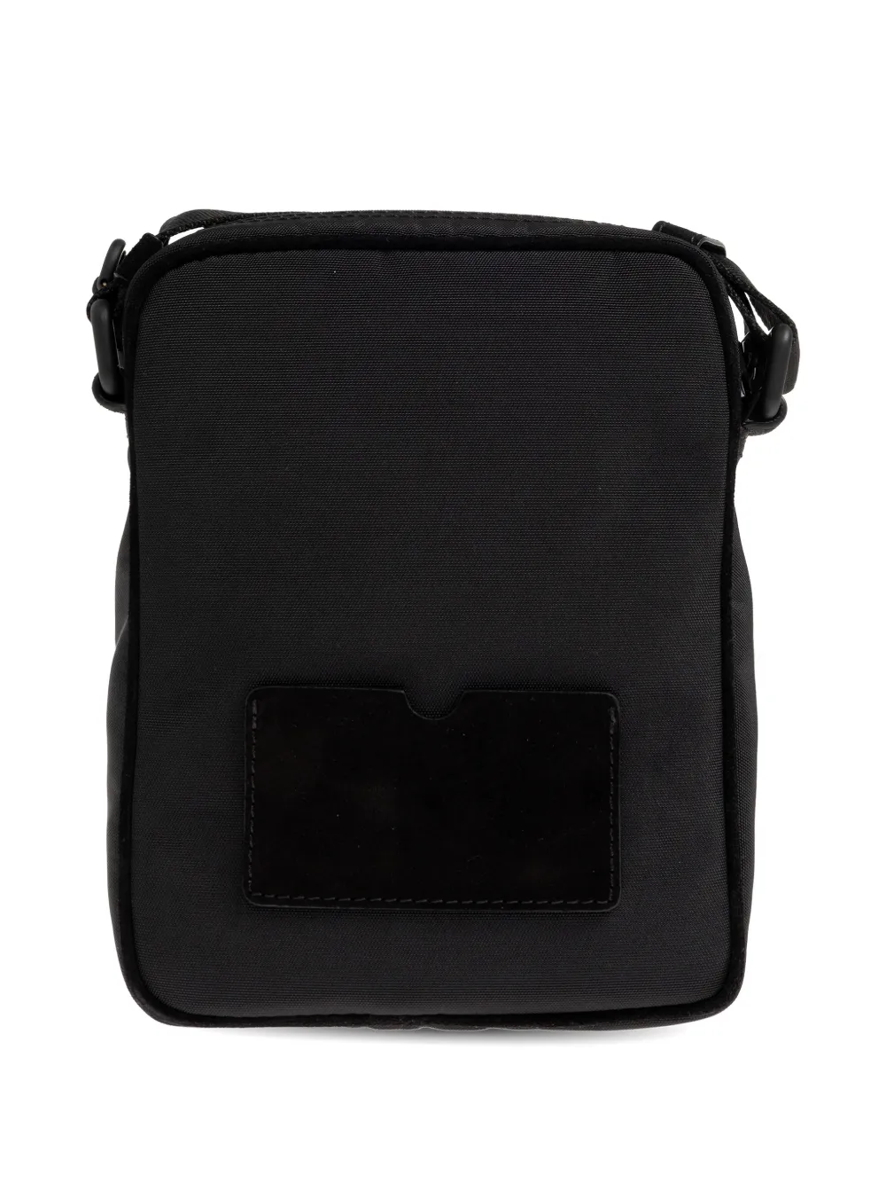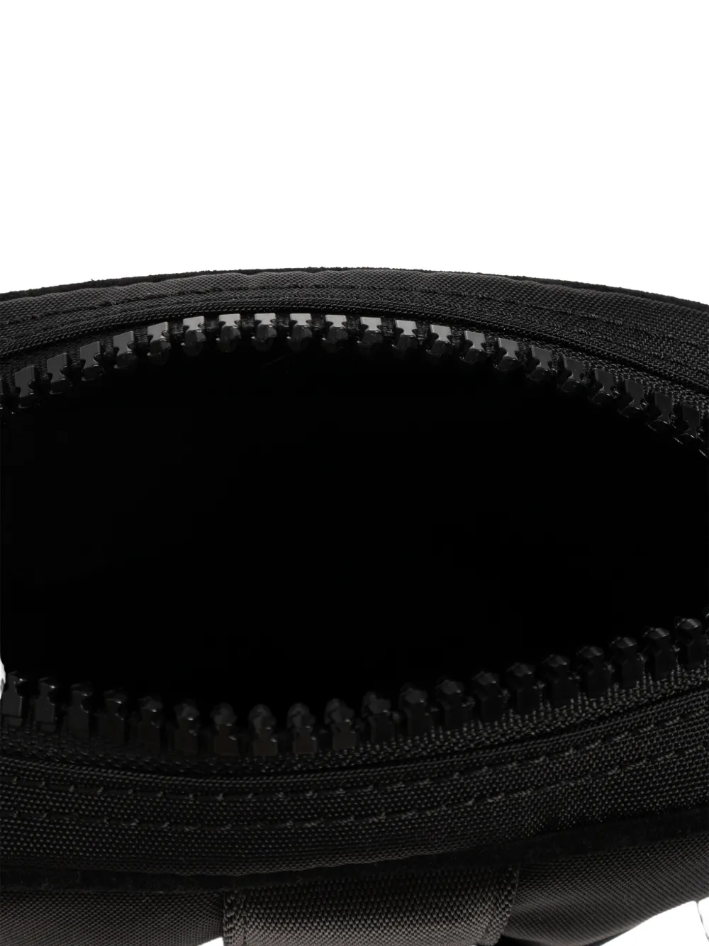 Черная сумка с логотипом, застежкой-молнией, наплечным ремнем и передним карманом