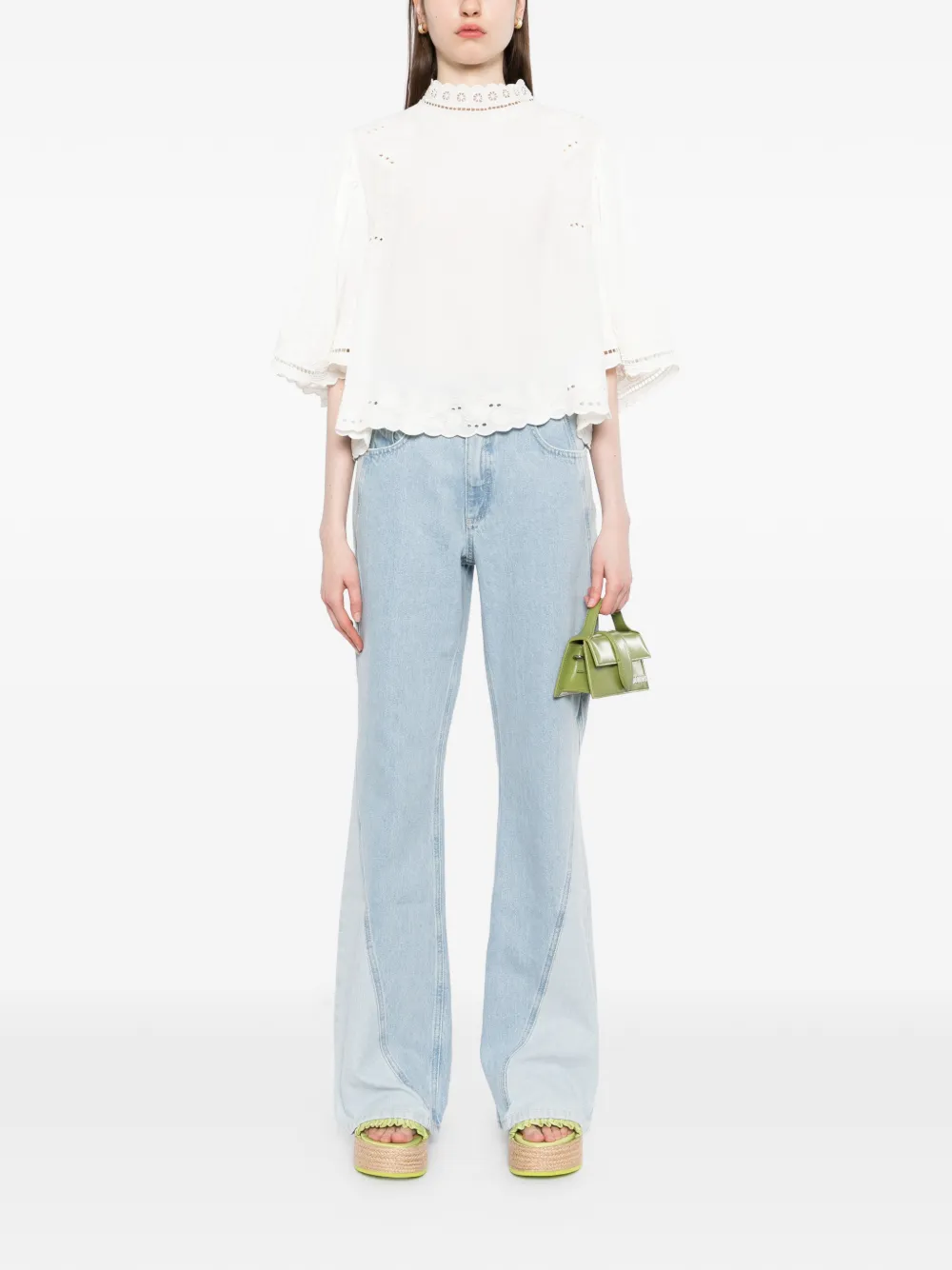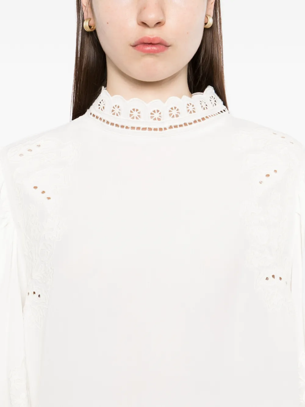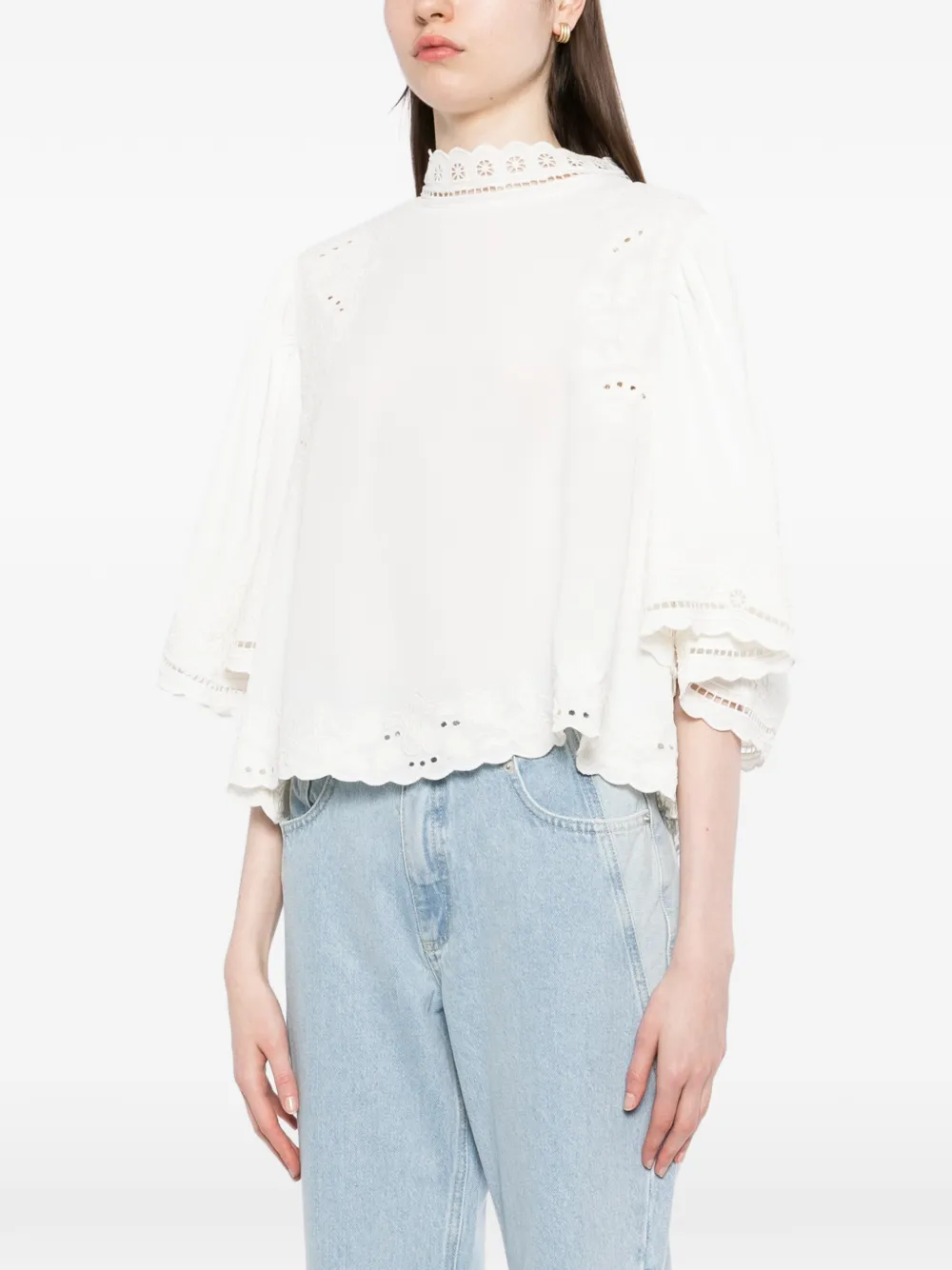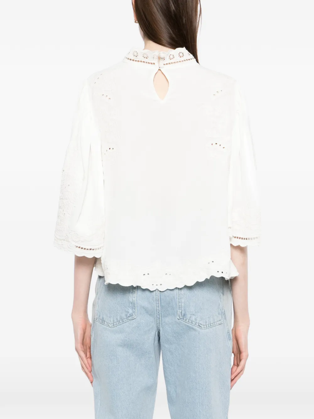 Белый цвет, кружевная отделка, вышивка в технике "айлет", зубчатый край, круглый вырез, рукава три четверти, разрез с пуговицей сзади