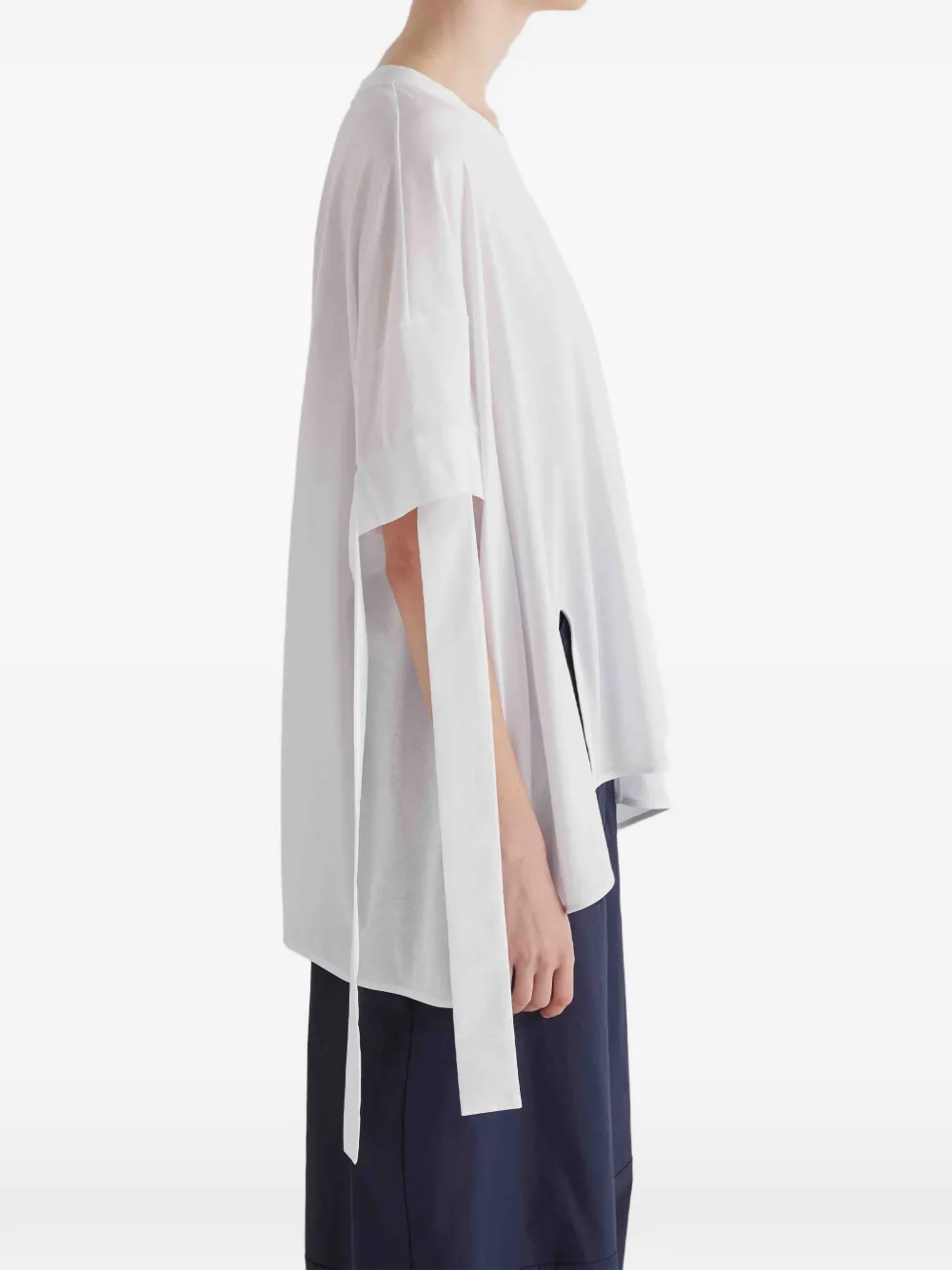 Белая хлопковая блузка с завязками, разрезом, каплевидным вырезом на спине и короткими рукавами