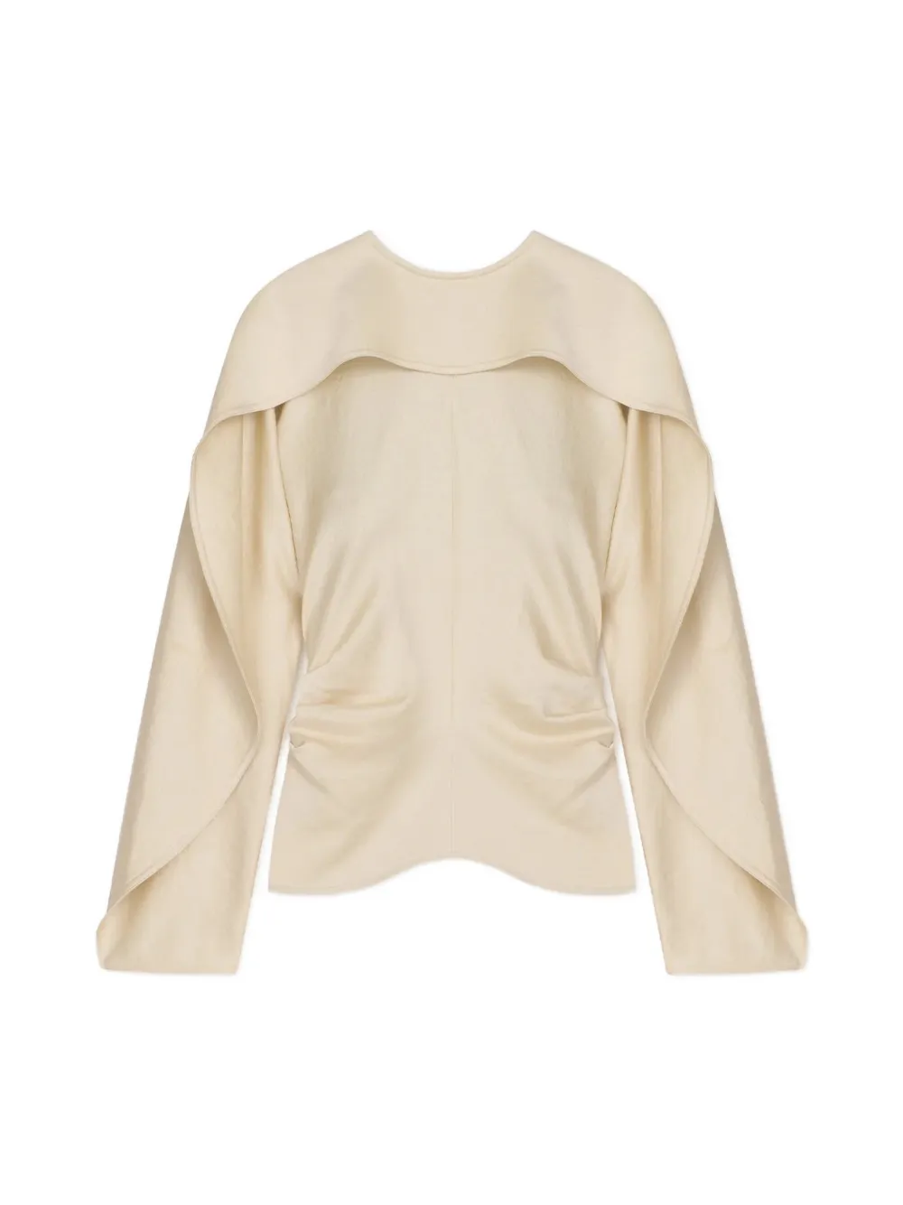 Белая блузка с пилигримским воротником, длинными рукавами, приталенным кроем и драпировкой