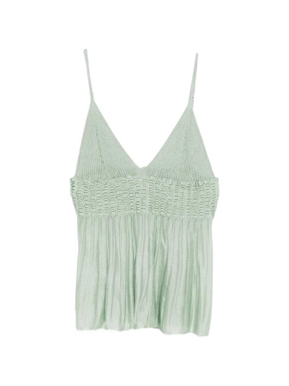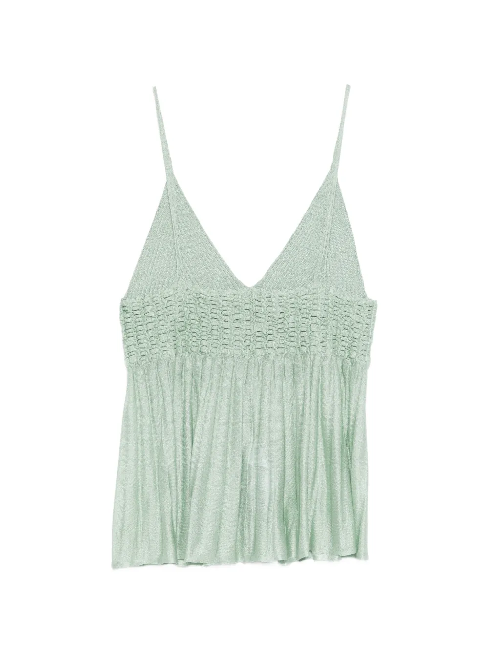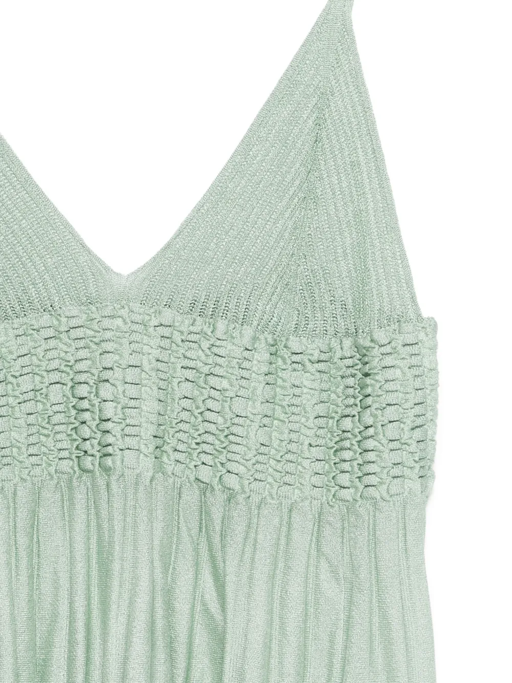 Светло-зеленое платье с плиссированными деталями, тонкими бретелями и V-образным вырезом