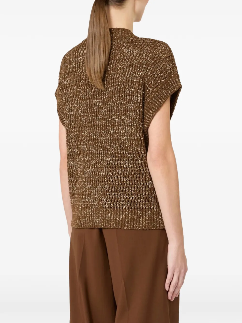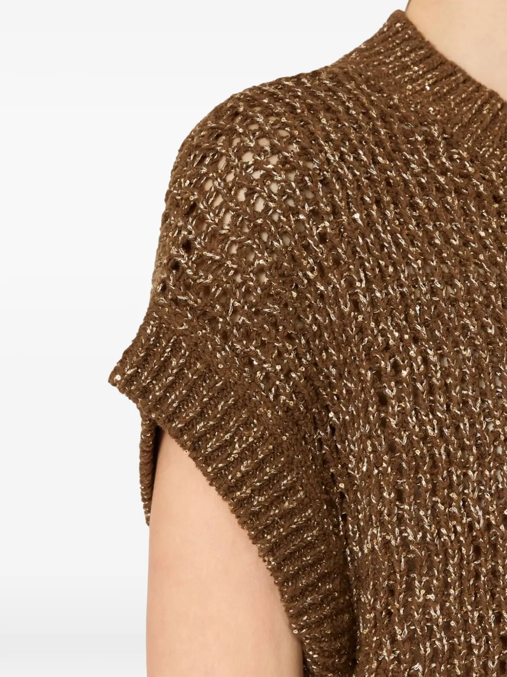 Коричневый топ с ажурным дизайном, короткими рукавами и круглым вырезом