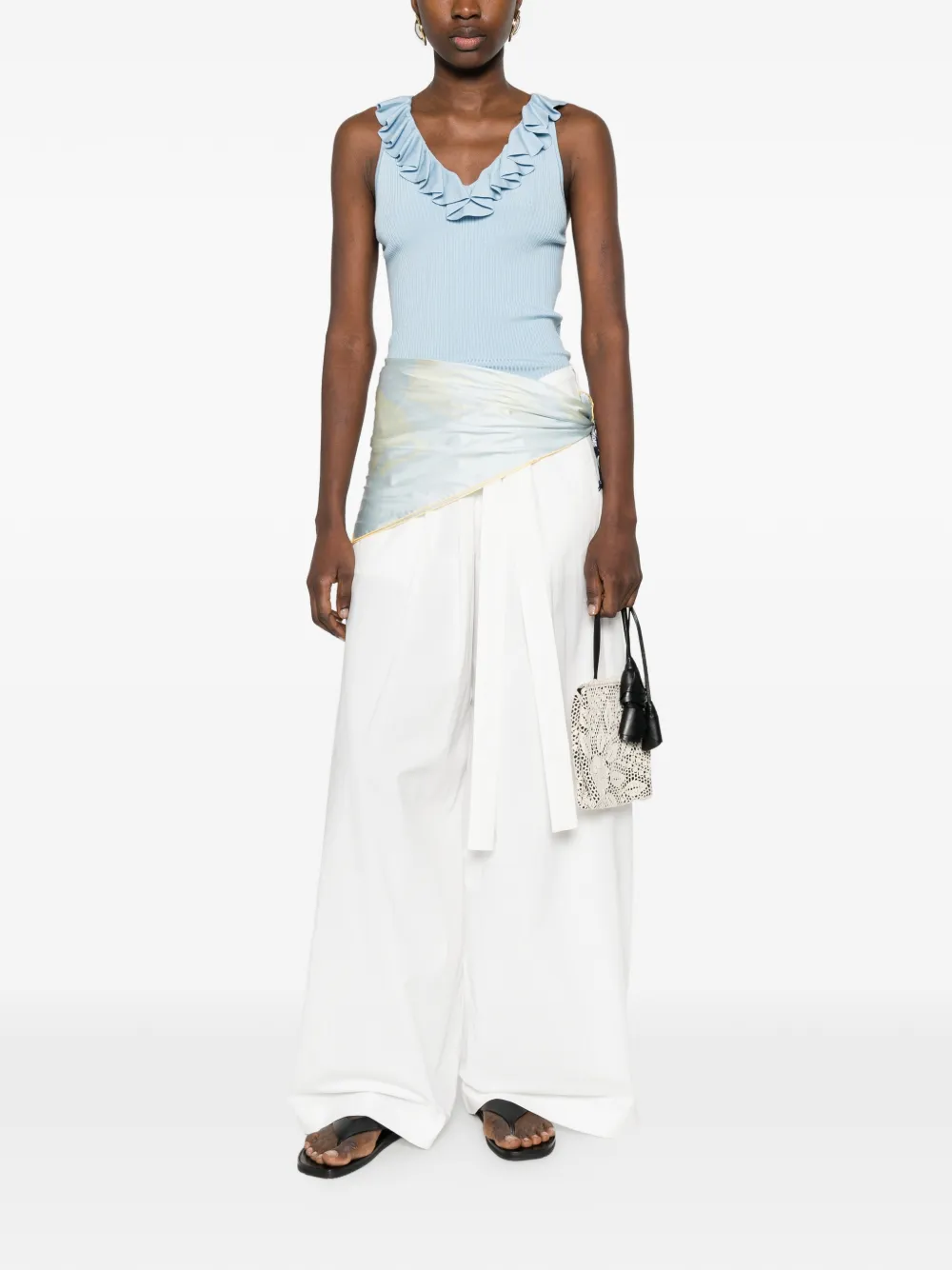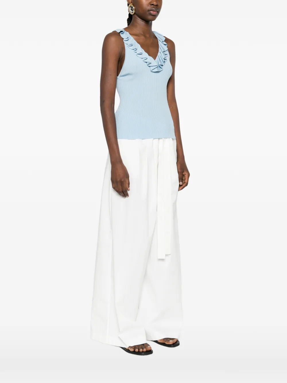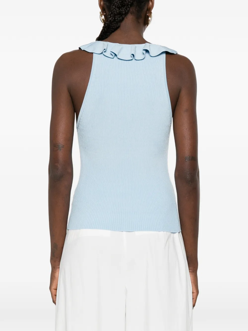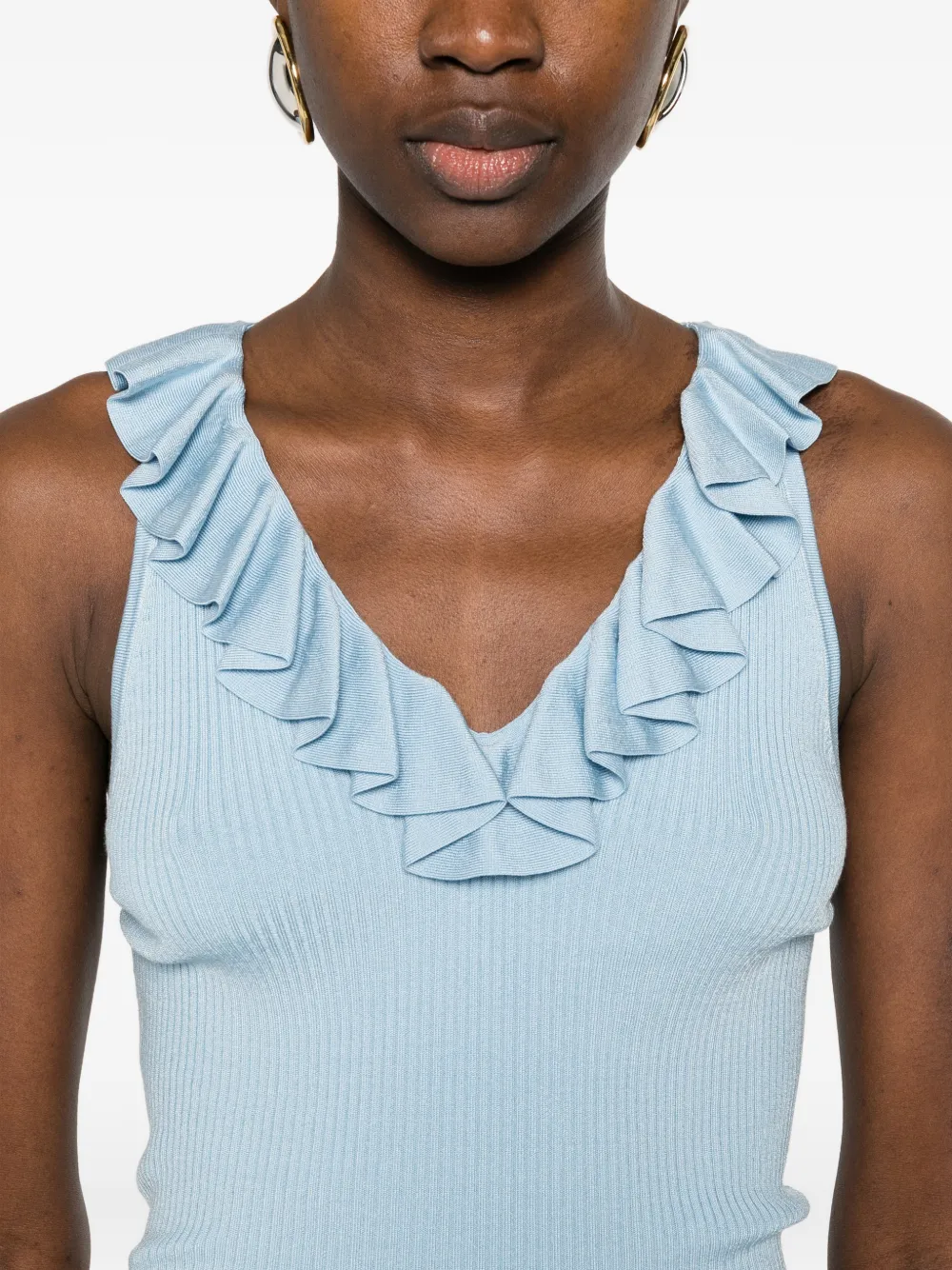 Синий врубчатый трикотажный топ с V-образным вырезом и отделкой рюшами