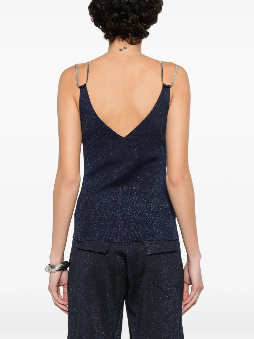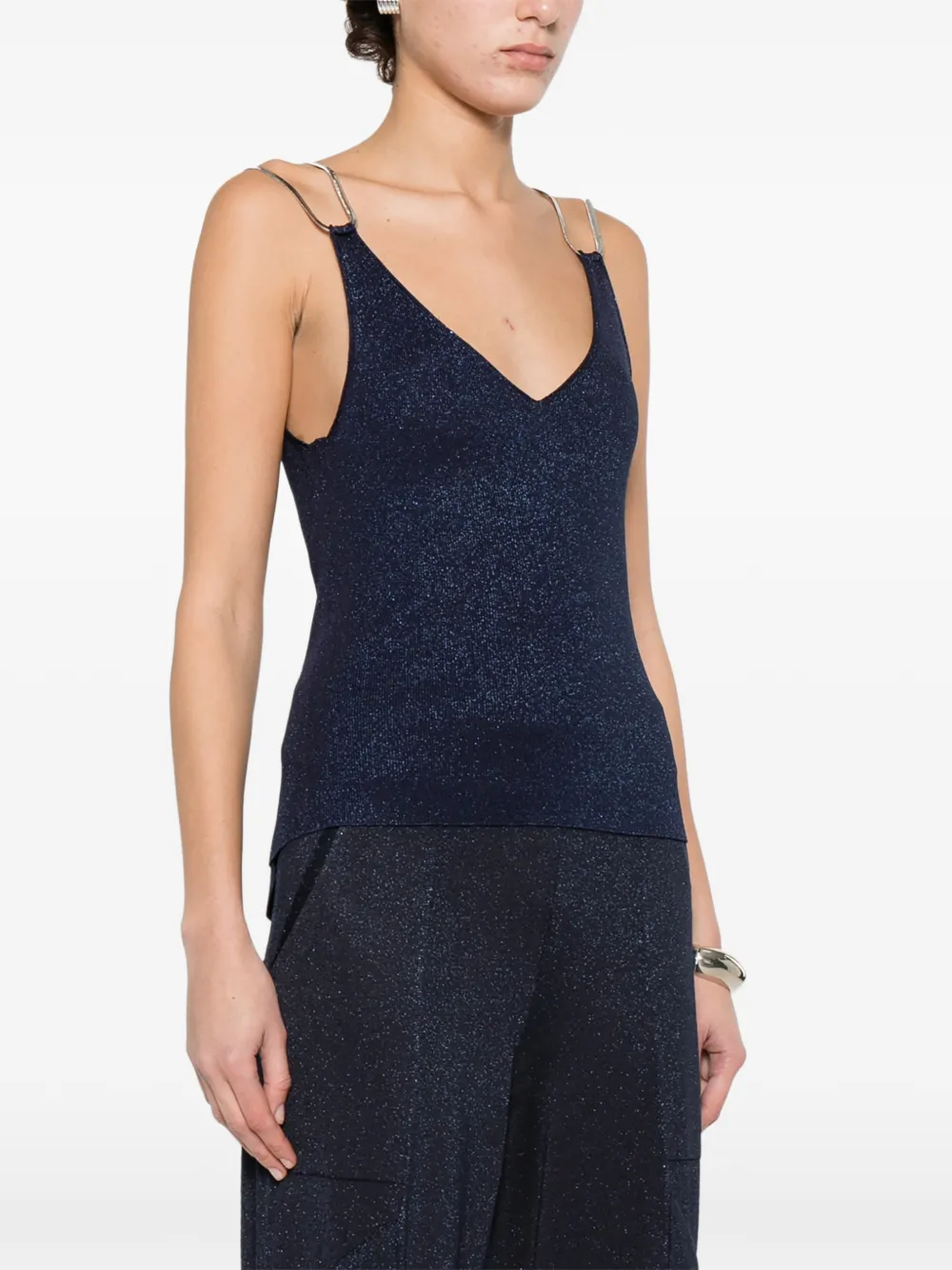 Синее платье с цепочками на бретелях и V-образным вырезом