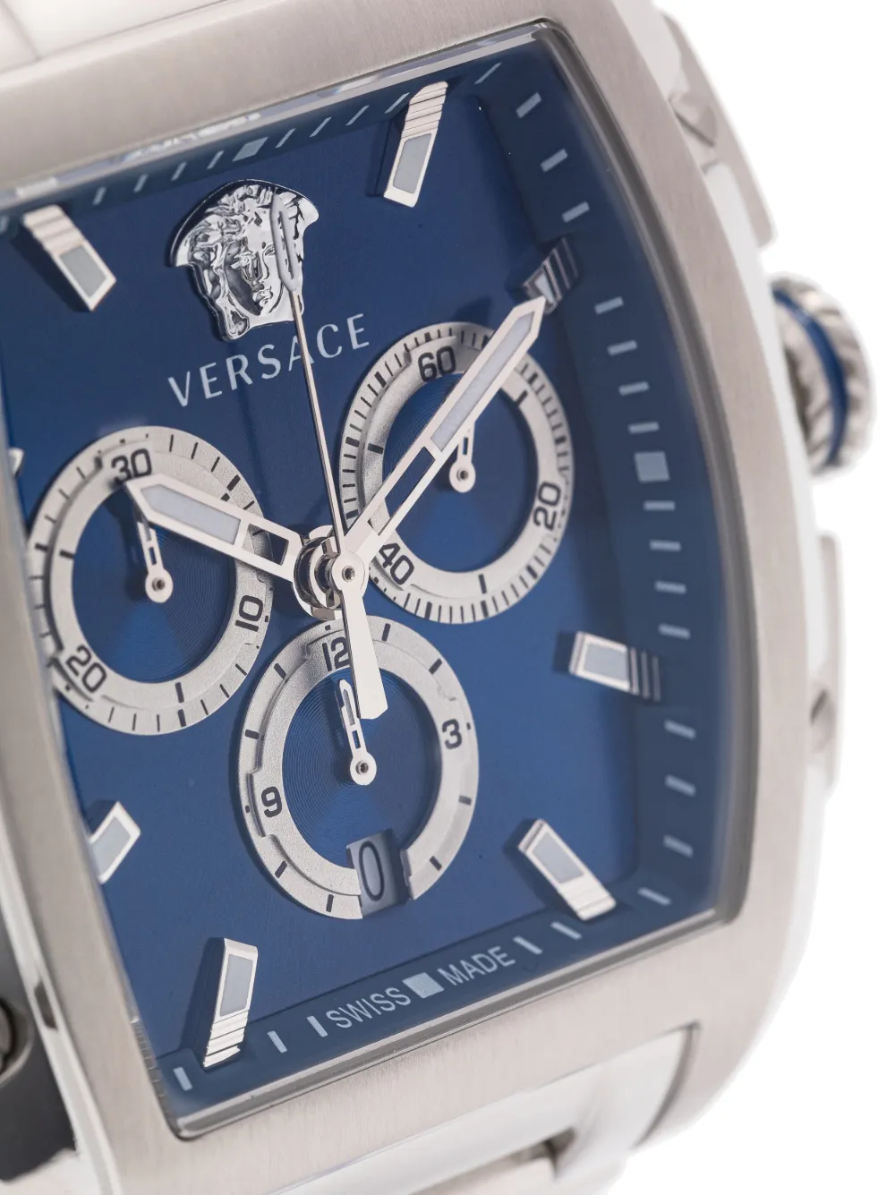 Индиго, нержавеющая сталь, бочкообразный корпус, прямоугольные вытянутые индексы, прямоугольные вытянутые стрелки, хронограф, индикатор даты, завинчивающаяся заводная коронка, регулируемый браслет со звеньями, знаковый орнамент Greca и потайная застежка. На этот товар распространяется стандартная годовая гарантия от бутика.