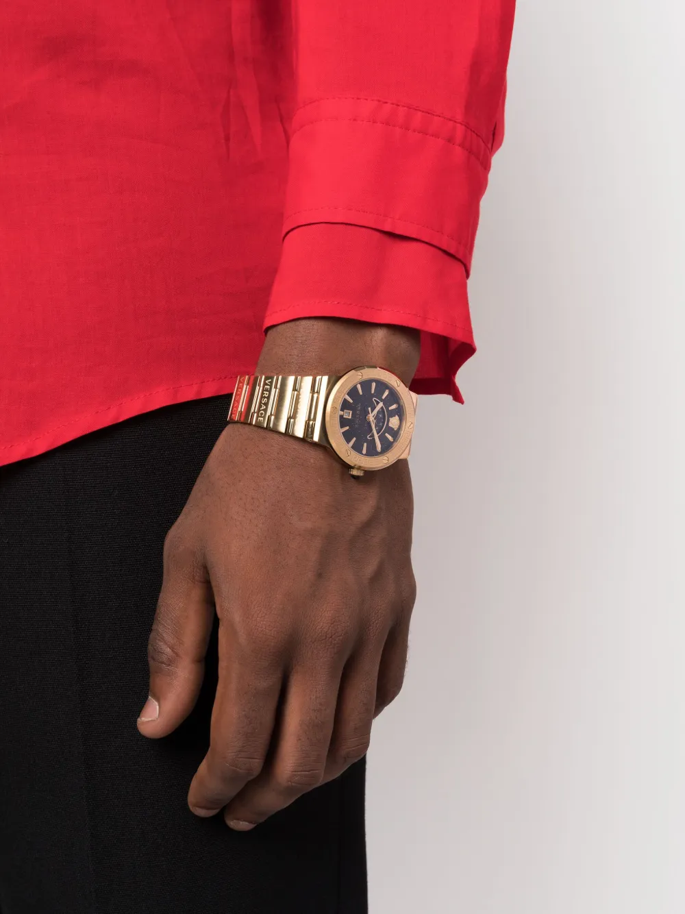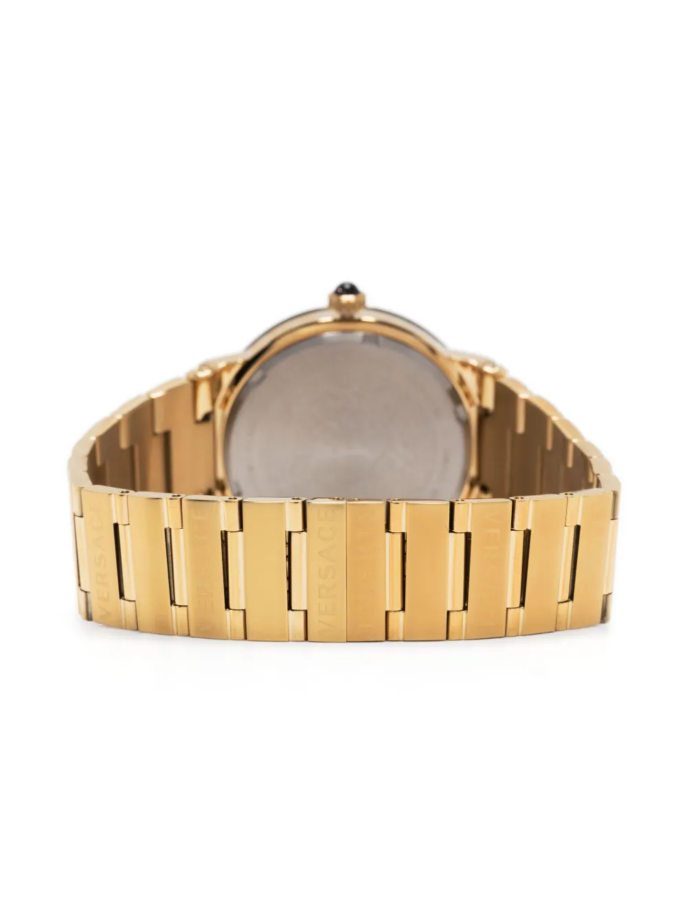 Золотистый, кварцевый механизм, циферблат Sunray, узор Medusa Head, дисплей с датой и днем, браслет из нержавеющей стали, раскладная застежка и водонепроницаемость до 50 метров/5 АТМ.