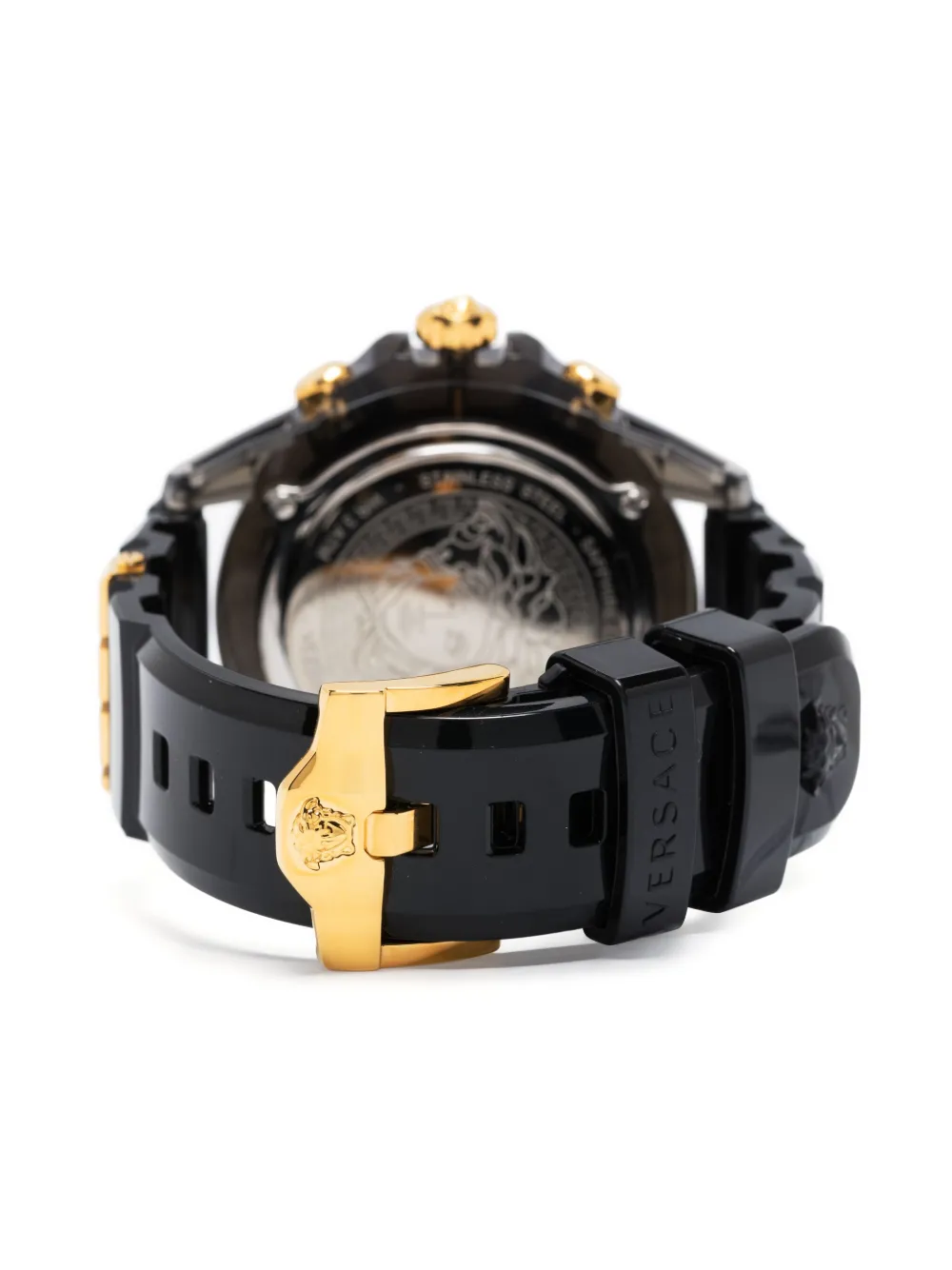 Черный, золотистый, кварцевый механизм, циферблат с бриллиантами, узор Medusa Head, индикатор даты, хронограф, круглый корпус, браслет из нержавеющей стали и застежка на пряжке.