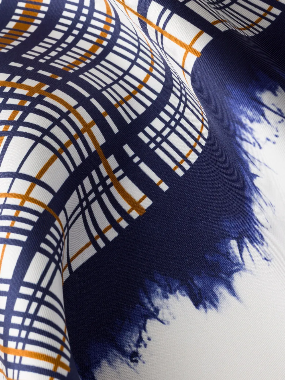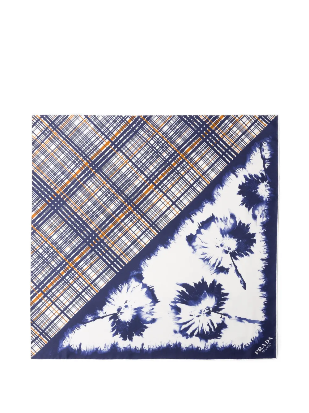 Принты, вдохновленные архивами Prada, украшают этот шарф из шелкового твила своей эклектичной привлекательностью. Принт Double Match: мадрас и тай-дай. Принтованный логотип.