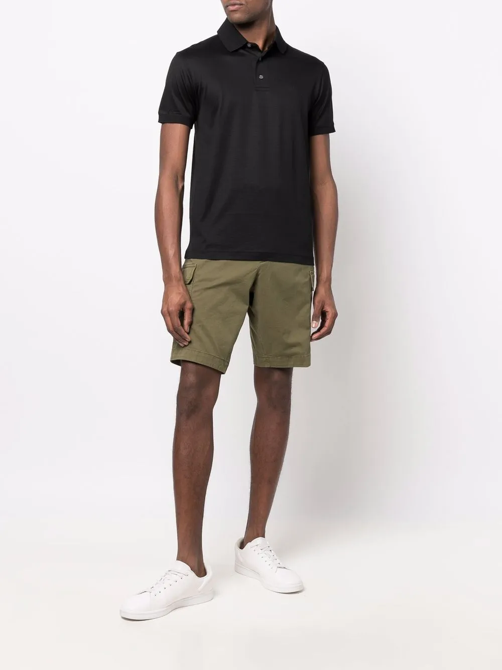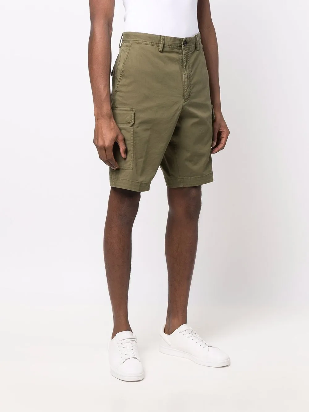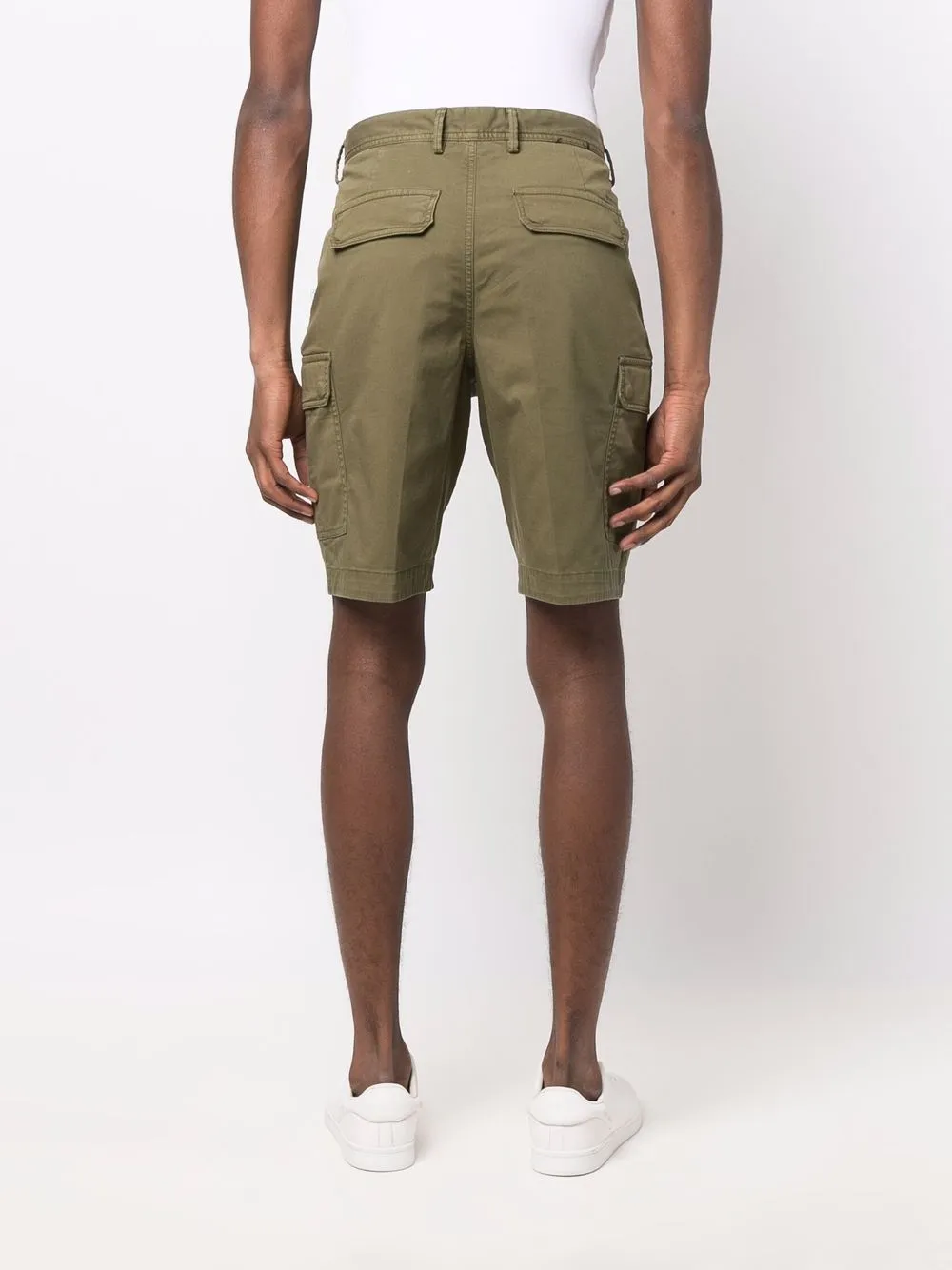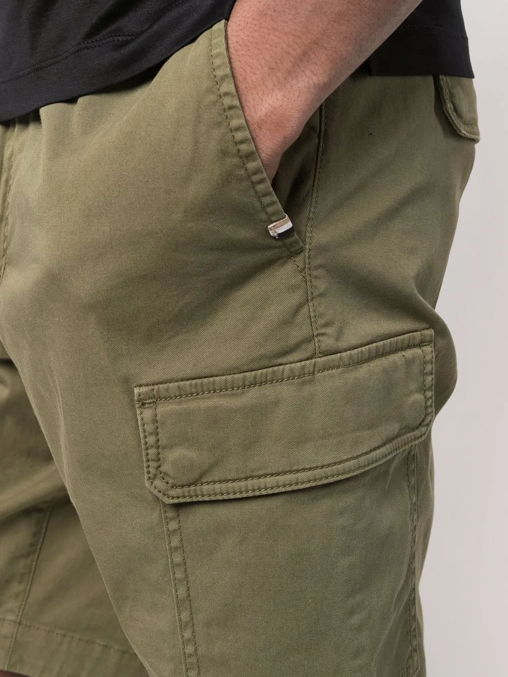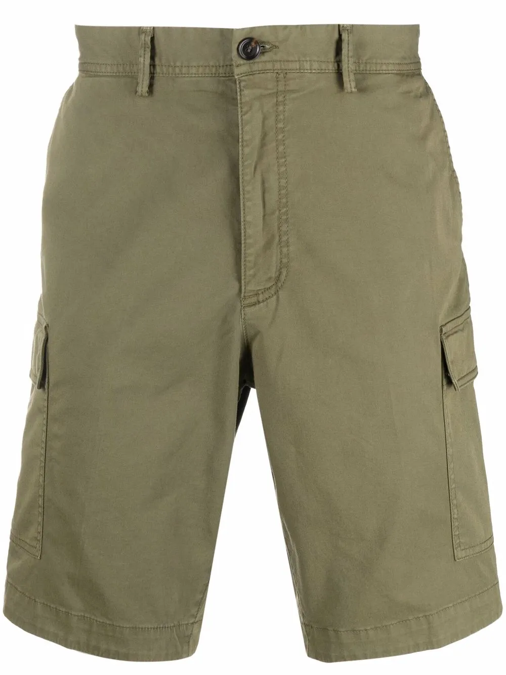 Оливковый, смесовый хлопок, ширинка на пуговицах, петли для ремня, два вшитых кармана по бокам, два кармана карго спереди, длина по колено и два кармана с клапанами сзади.