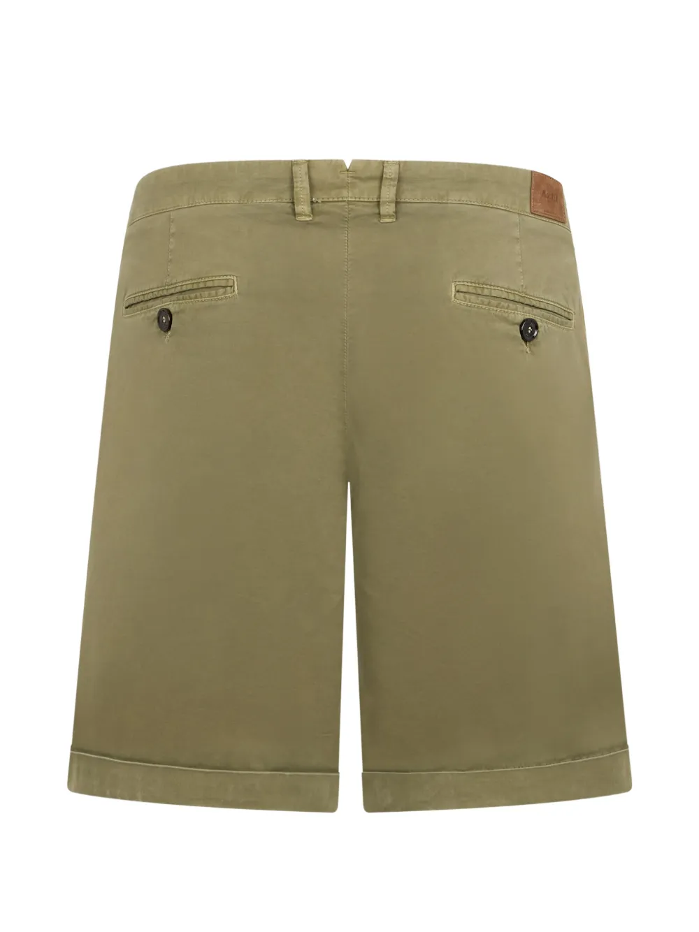 Зеленый цвет, подоткнутый (отвороченный) край, шлевки для ремня, застежка на пуговицу, два задних прорезных кармана с застежкой на пуговицу