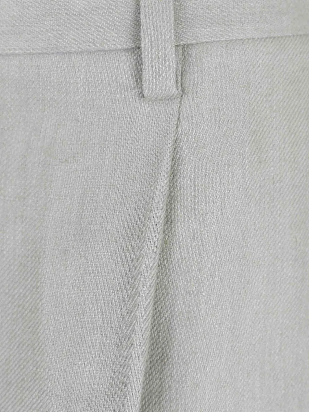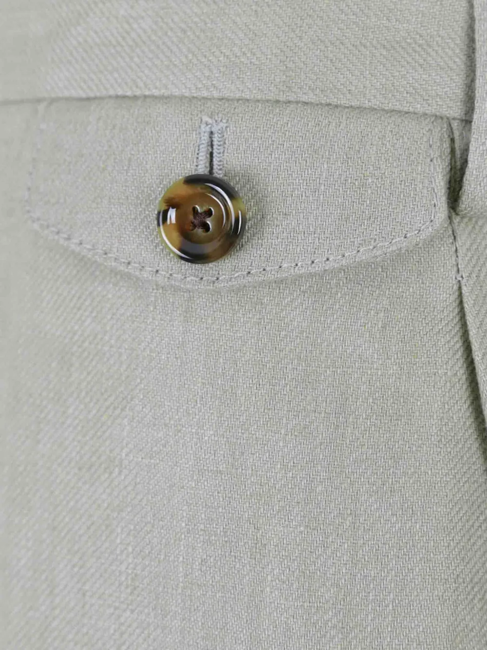 Светло-серые подвернутые манжеты, накладные карманы с клапанами на пуговицах, шлевки для пояса, складки спереди, застежка на пуговицы