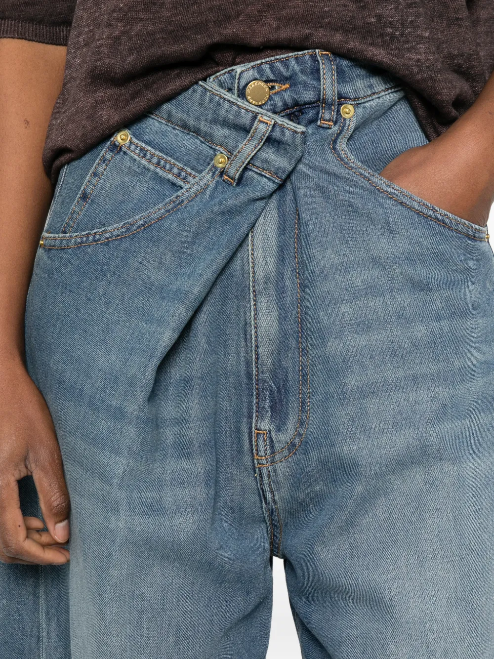 Синие широкие брюки с передними карманами, шлевками для ремня, застежкой-молнией и завышенной талией