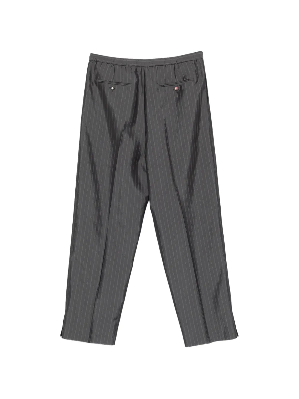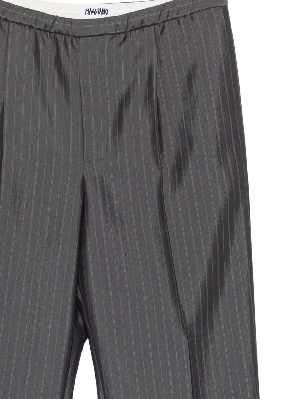 Темно-серый цвет с рисунком в полоску, фиксируется на шнурке, эластичный пояс, складки спереди