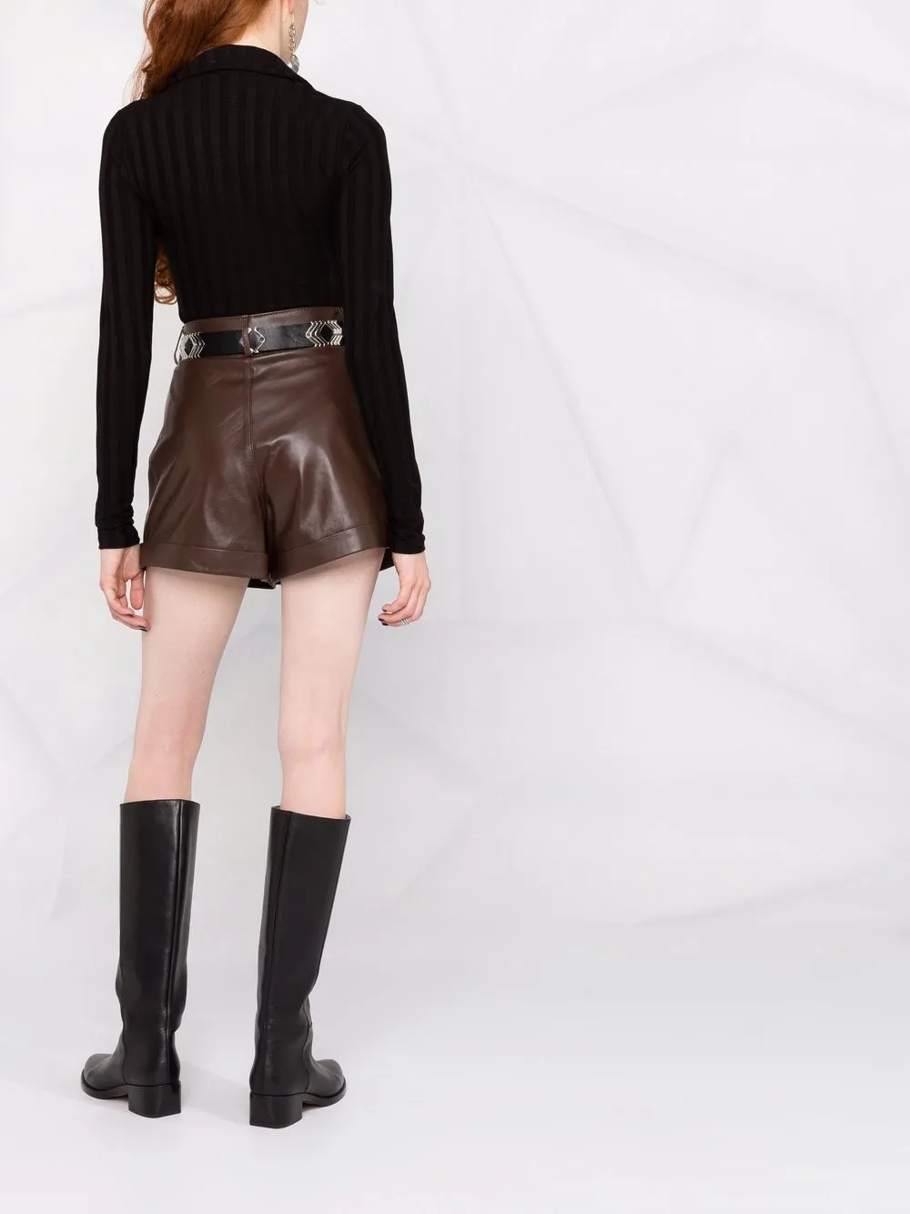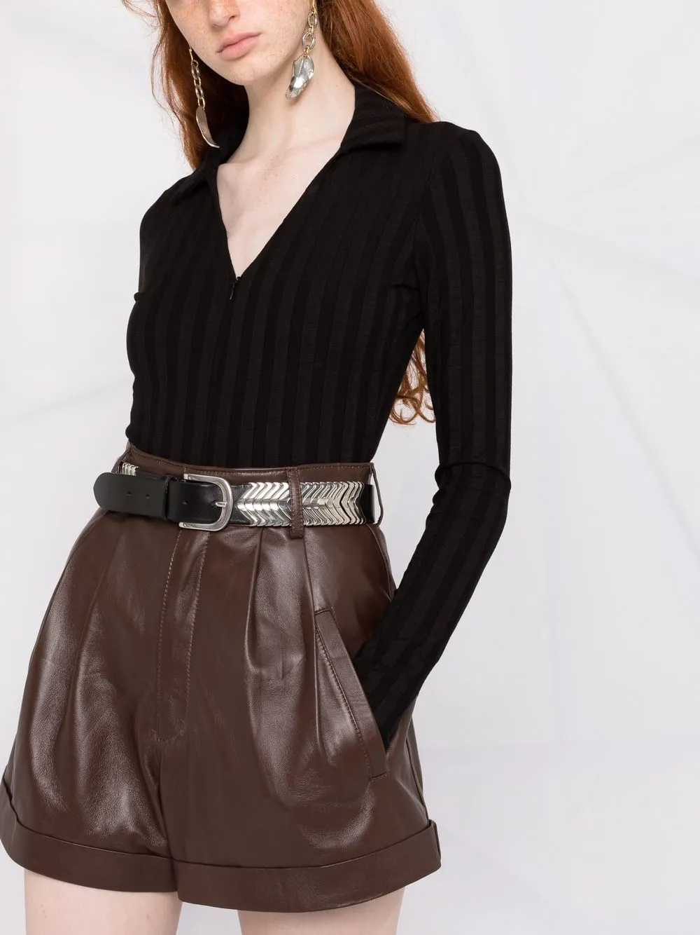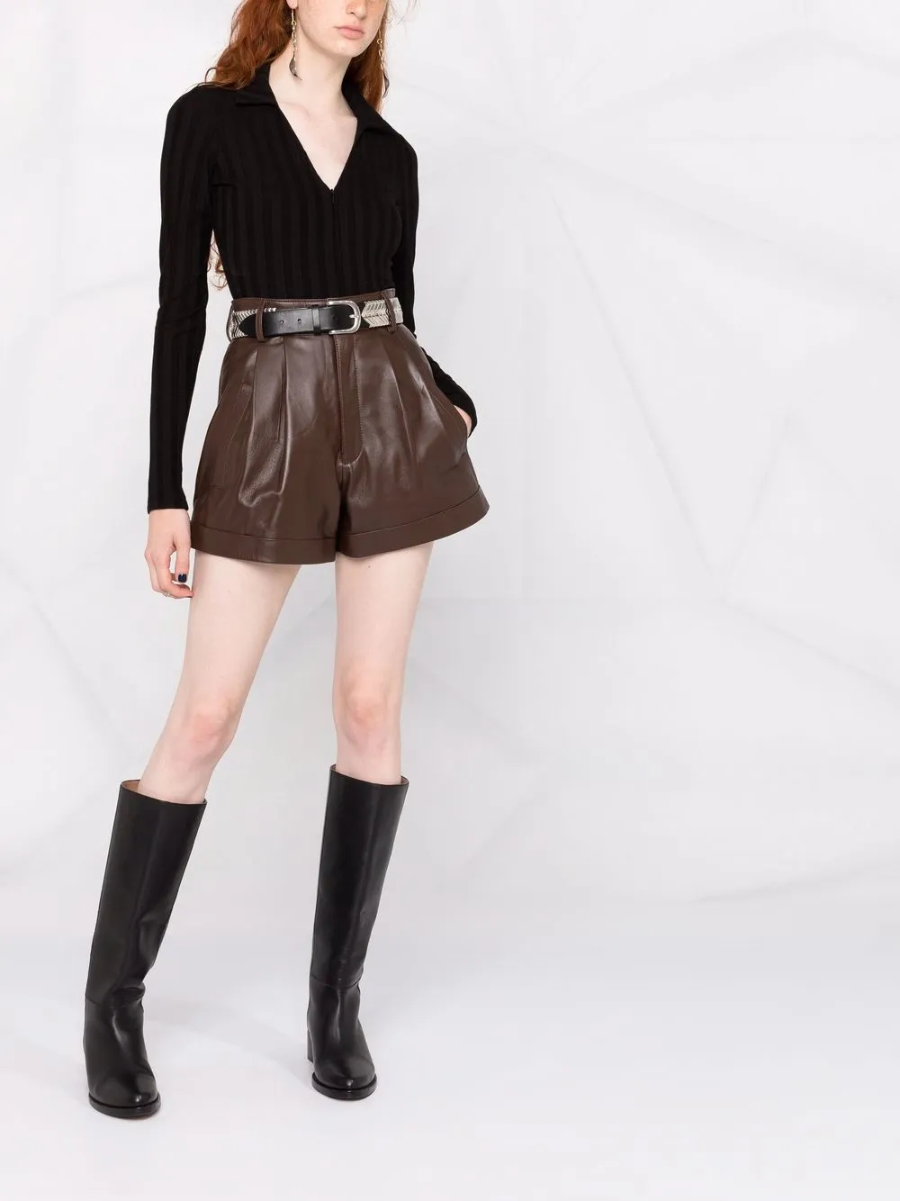 Плиссировка, завышенная талия, петли для ремня, подвороты и два кармана по бокам.