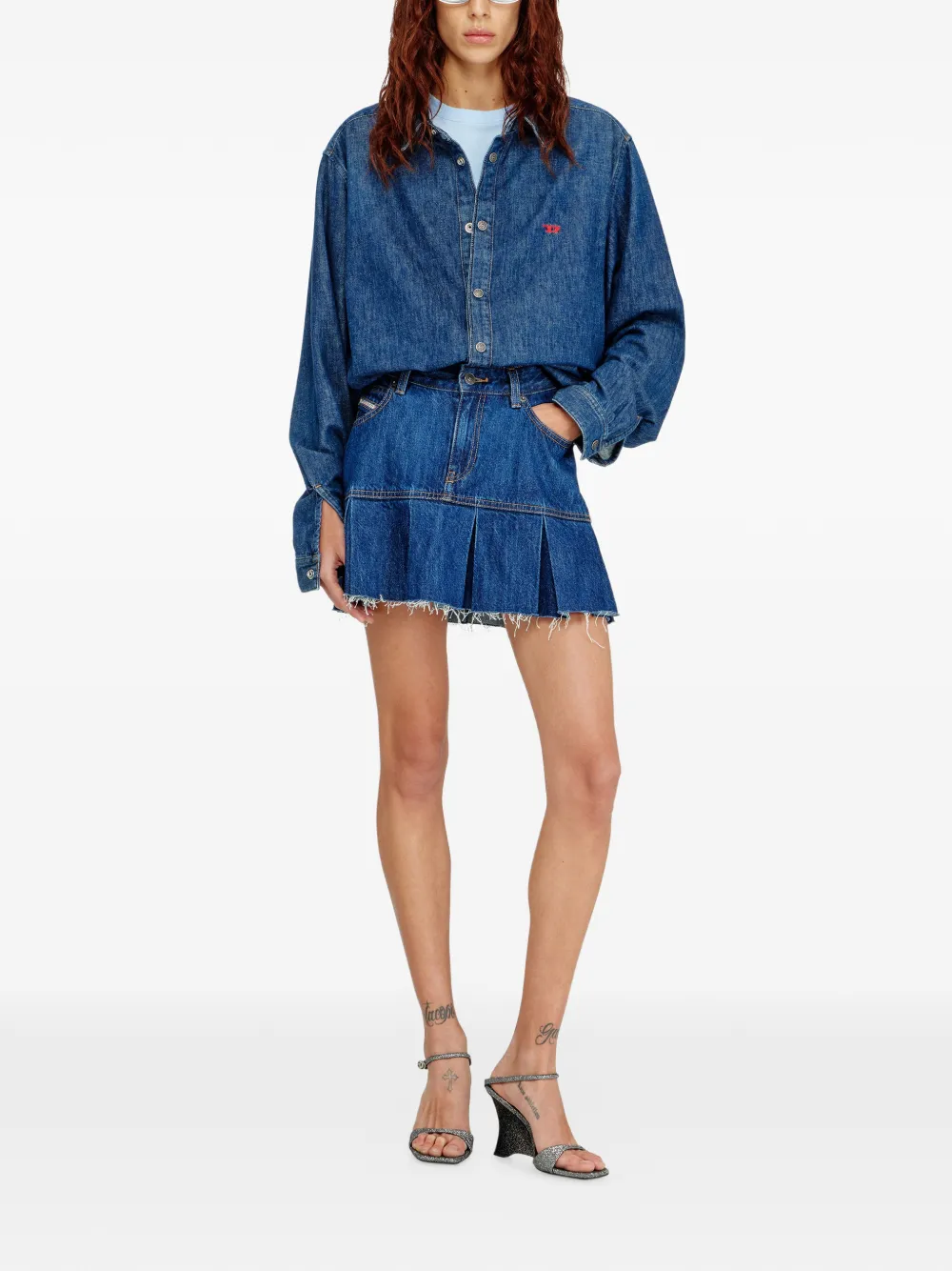 Синий деним, оборванный низ, плиссированные детали, пять карманов, шлевки для ремня, застежка на пуговицах, А-образный силуэт