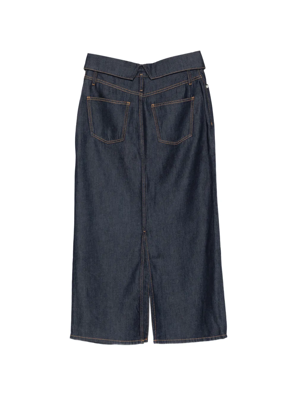 Синий, застежка на пуговицы, контрастная прострочка, разрез спереди, задние карманы