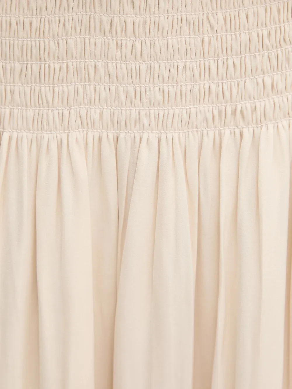 Бежевое расклешенное платье А-силуэта с разрезом сбоку и присборенной отделкой
