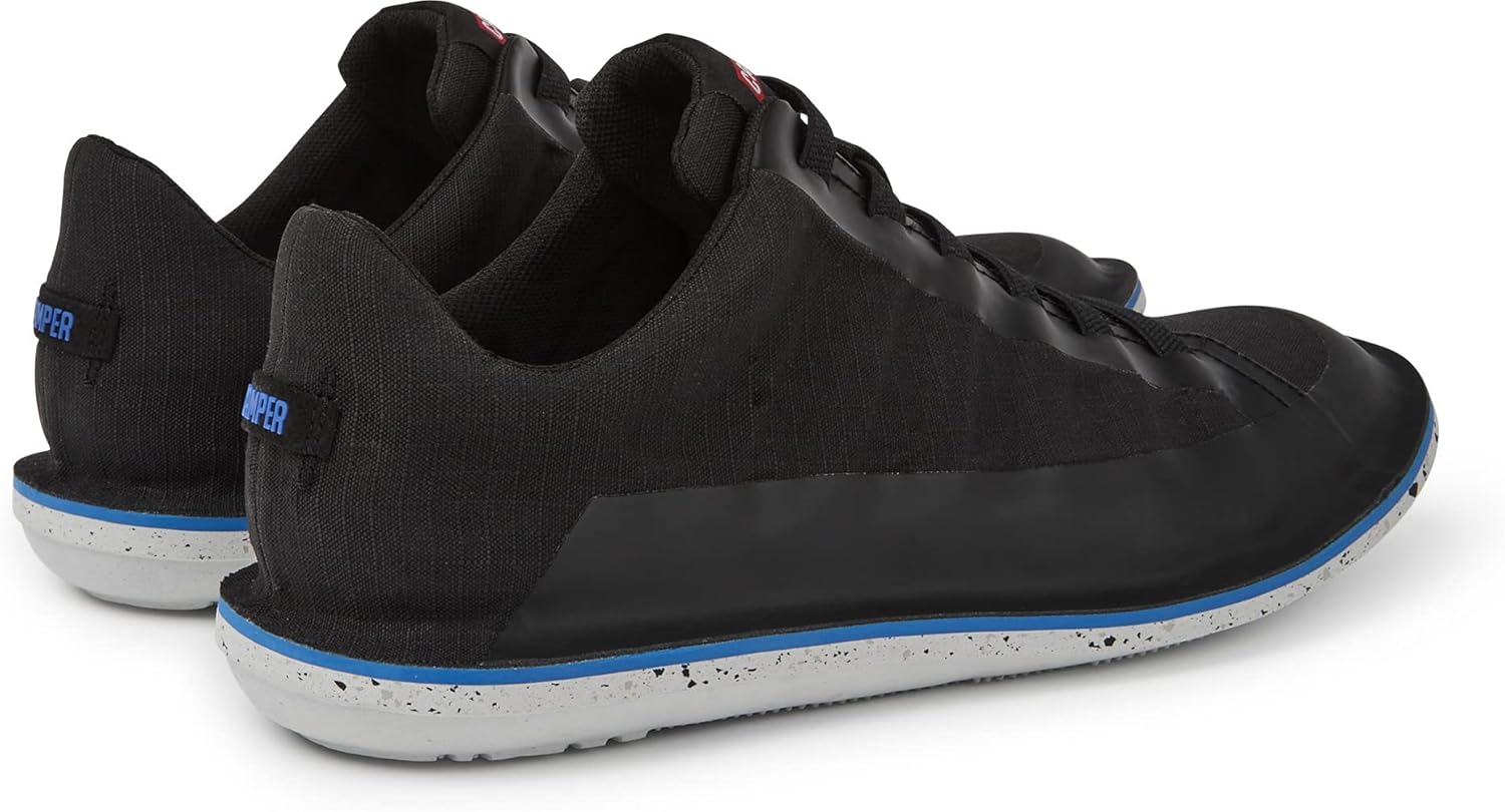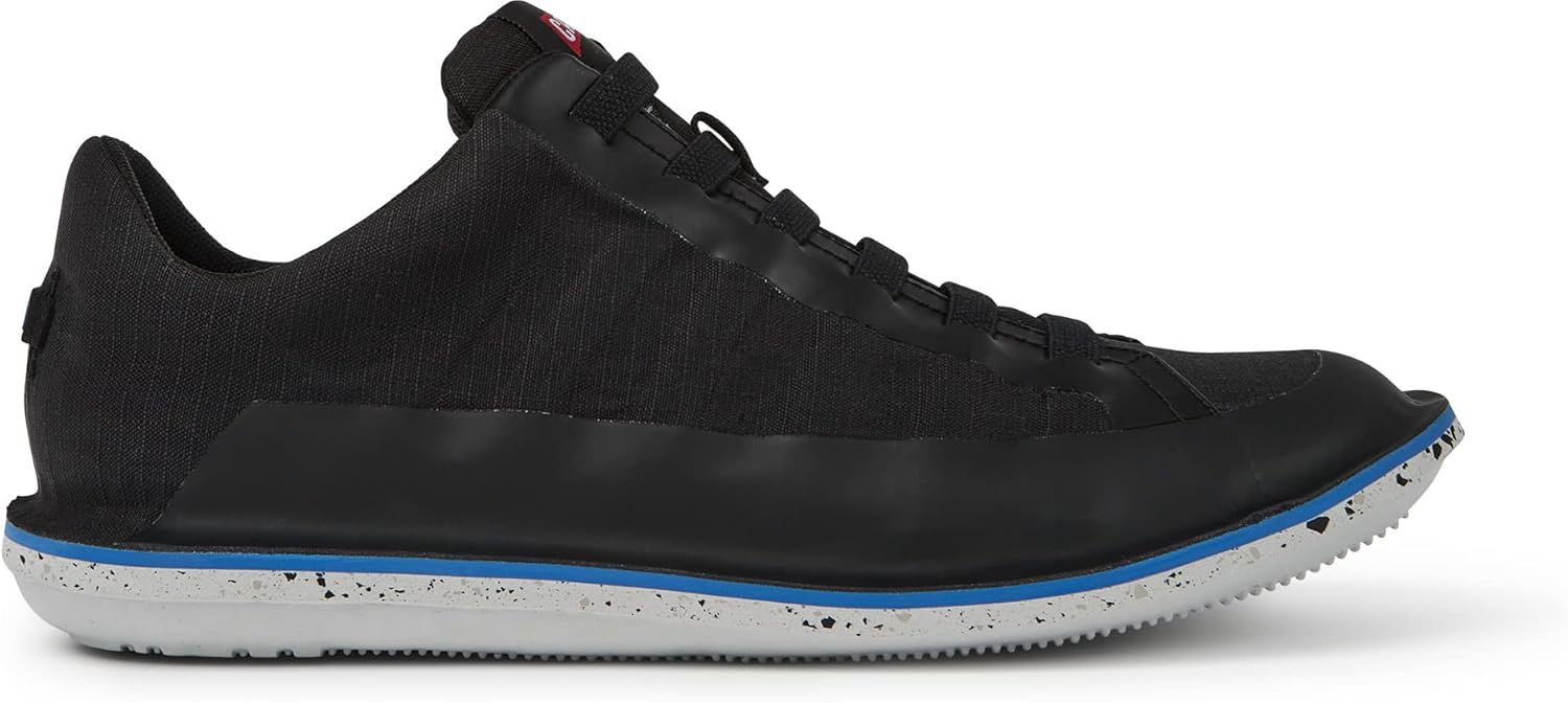 Мужские черные туфли. Верх из 80% переработанной ткани ПЭТ и эластичные шнурки. Бело-синяя подошва из 51% переработанного ЭВА. Икона Camper, которая меняется с каждым сезоном, наши мужские туфли Beetle легкие и гибкие, с герметичной конструкцией, сочетающей анатомическую форму с оригинальным дизайном.