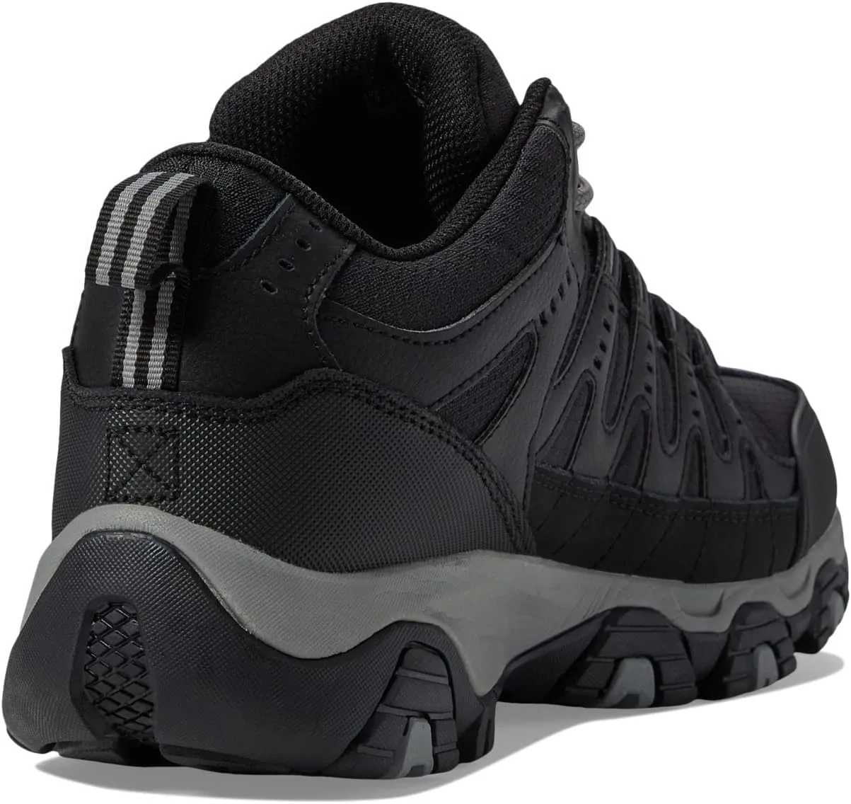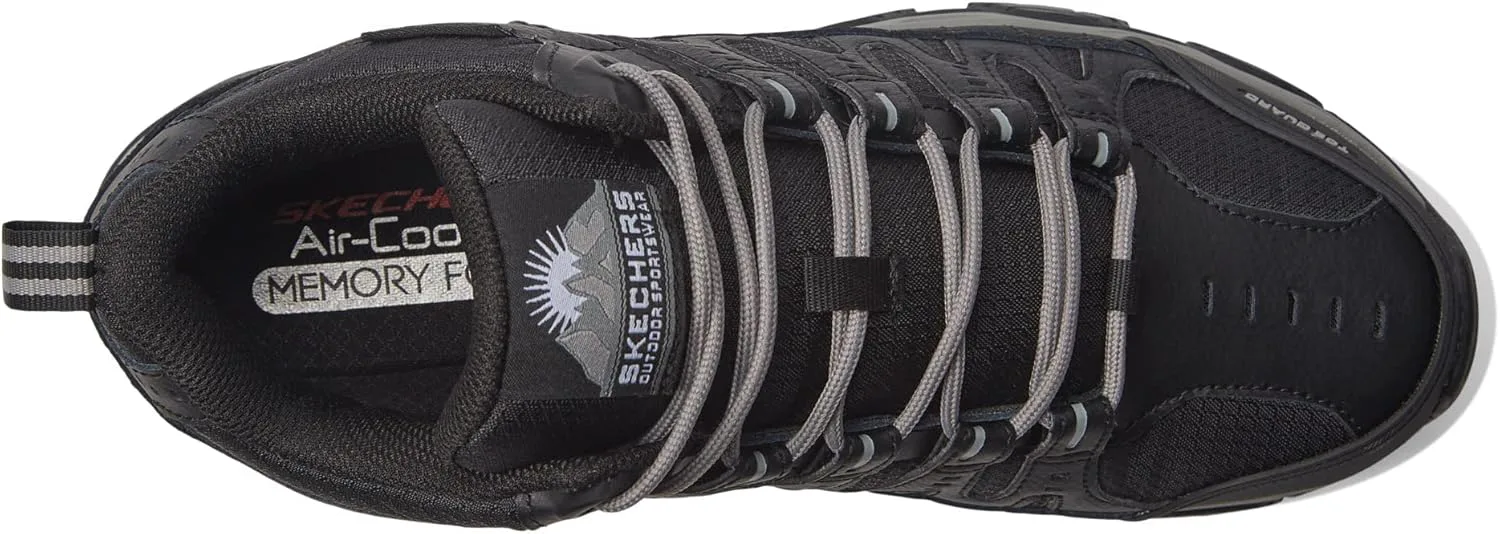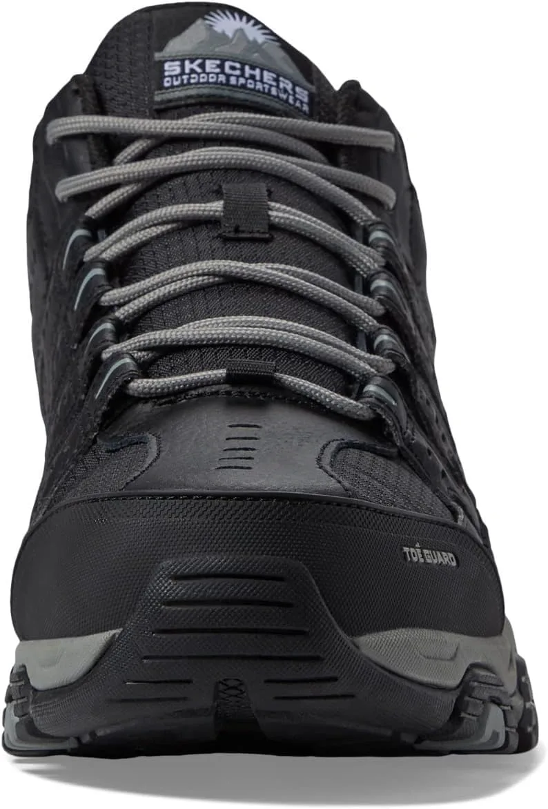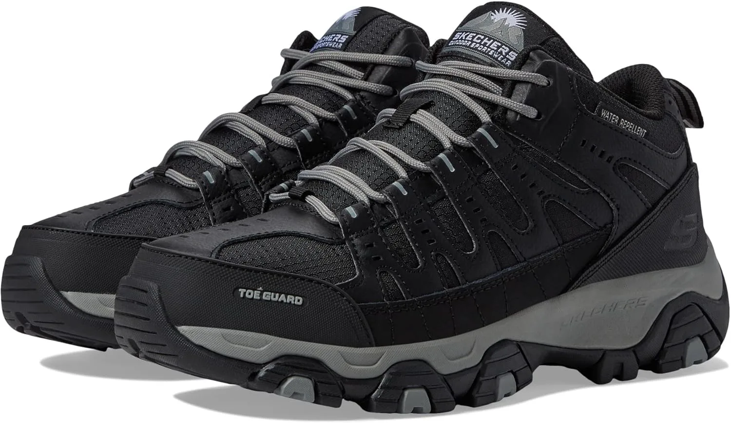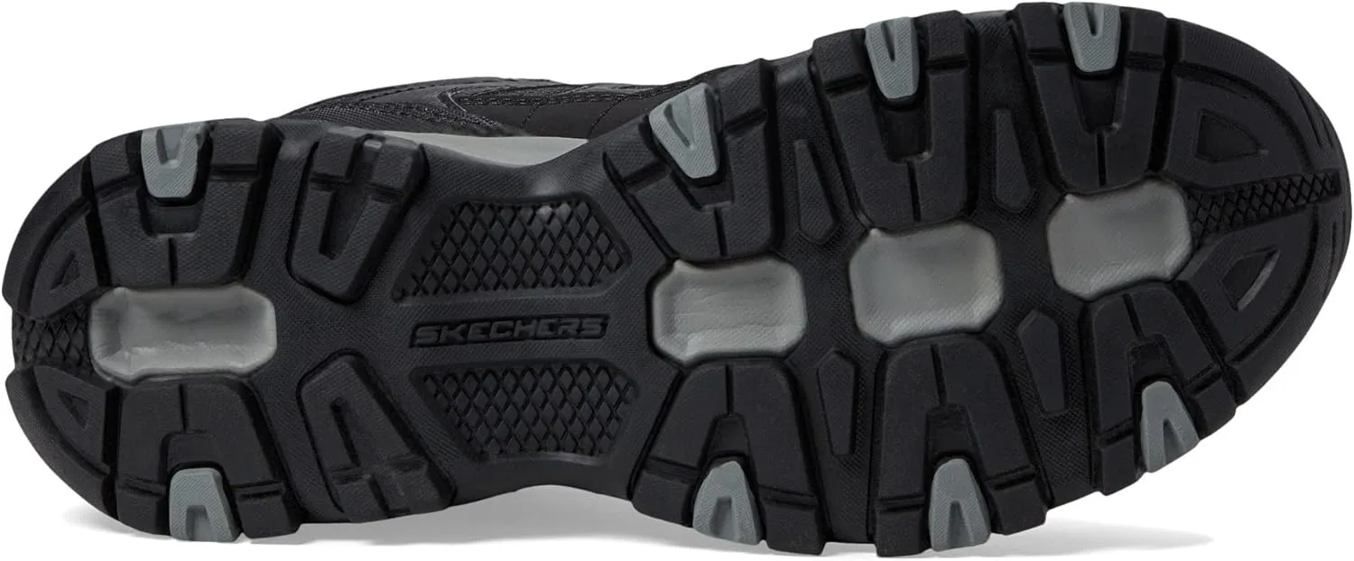 Flex an athletic look wearing SKECHERS Terrabite Ravlin Sport Shoes. Leather and textile upper. Textile lining and insole. Lace closure. Pull tab at the back. Brand logo on the tongue. Round toe. Synthetic outsole.