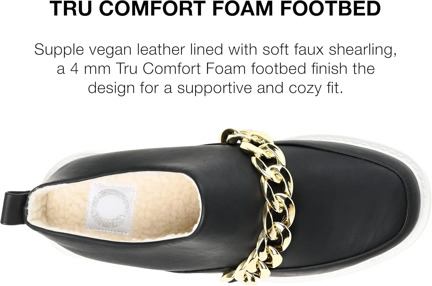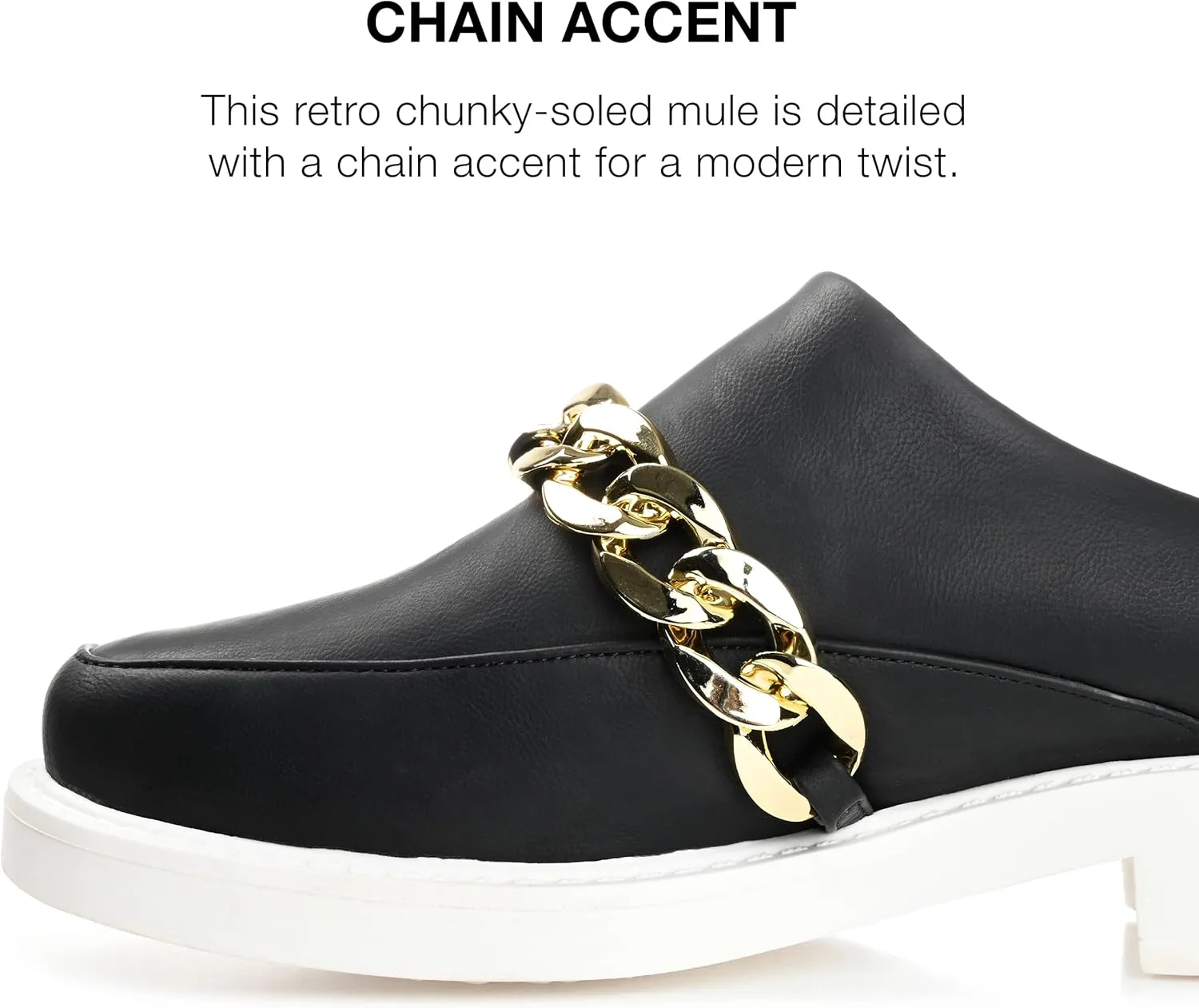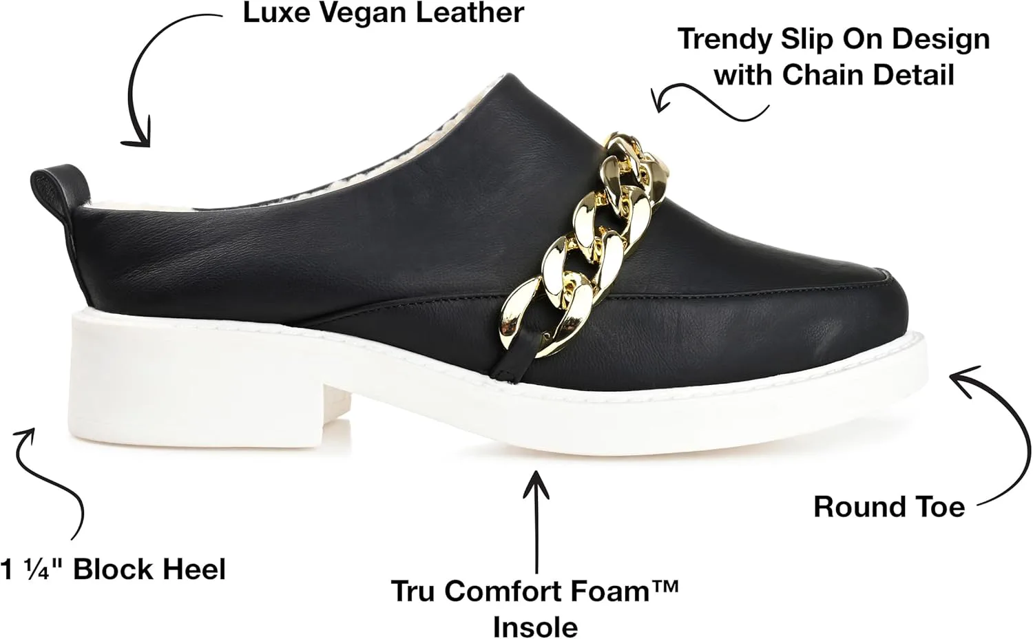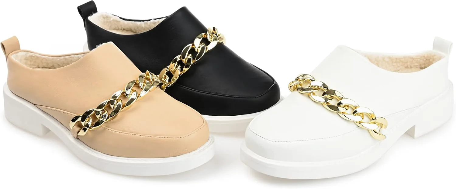 Современная версия лоферов без каблука - модель Sheah от Journee. Эти ретро-мюли выглядят беззаботно стильно благодаря мягким верхам из веганской кожи и декоративной цепочке. Массивная белая подошва и очень поддерживающая стелька толщиной 4 мм с мягкой искусственной шерстой завершают дизайн, обеспечивая комфортную и удобную посадку. В Journee наши модели без каблука помогут вам выглядеть так же профессионально, как начальник на работе, и иметь самые милые туфли, когда вы выходите вечером.