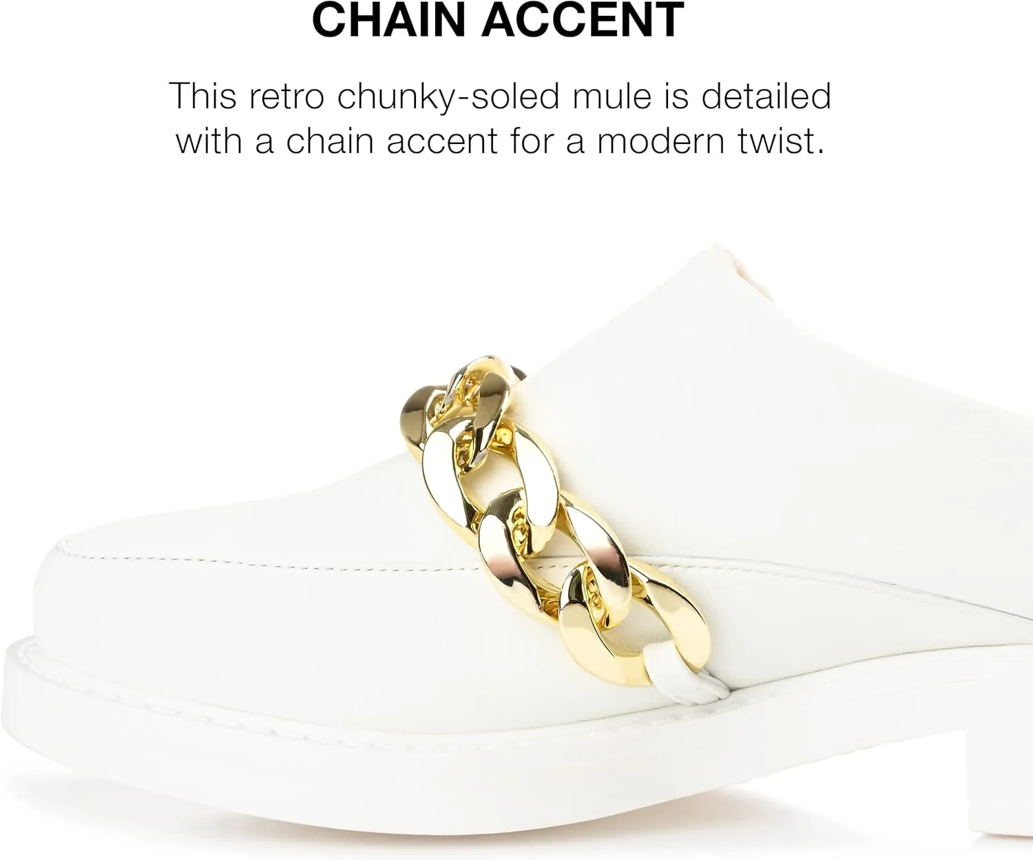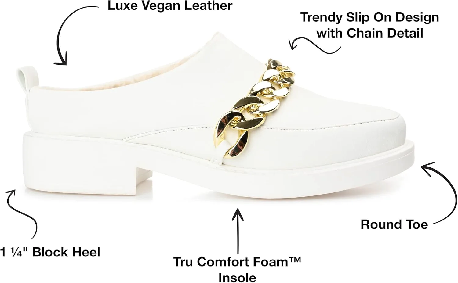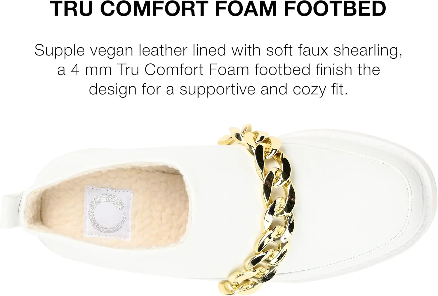Современная версия лоферов без каблука - модель Sheah от Journee. Эти ретро-мюли выглядят беззаботно стильно благодаря мягким верхам из веганской кожи и декоративной цепочке. Массивная белая подошва и очень поддерживающая стелька толщиной 4 мм с мягкой искусственной шерстой завершают дизайн, обеспечивая комфортную и удобную посадку. В Journee наши модели без каблука помогут вам выглядеть так же профессионально, как начальник на работе, и иметь самые милые туфли, когда вы выходите вечером.