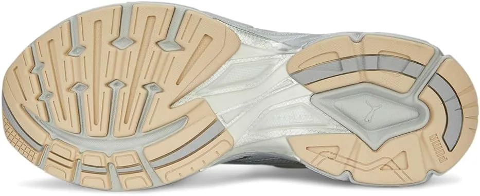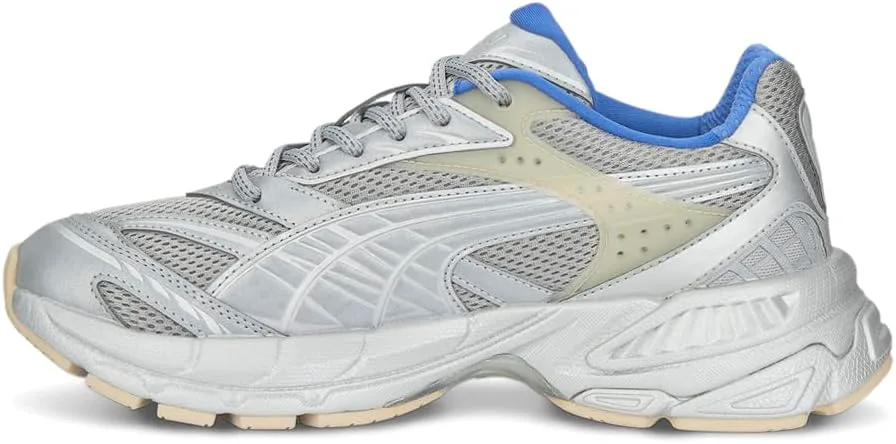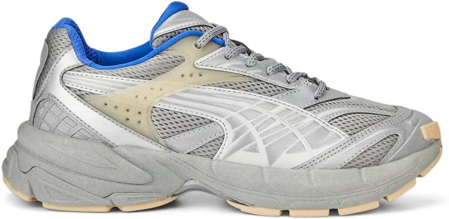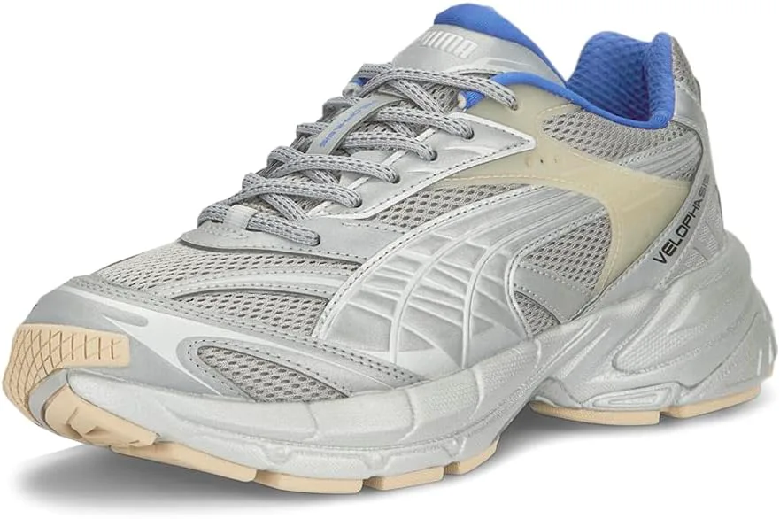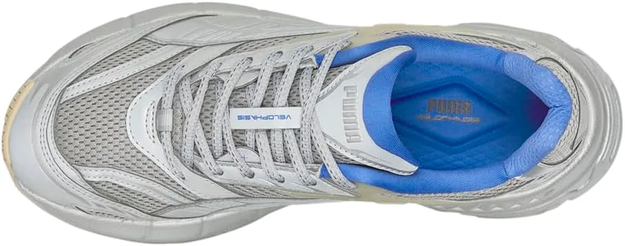 Силуэт Bionic Velophasis имеет верх из сетки с кожаными накладками, мягкий воротник, ТПУ-люверсы, логотип Puma на языке, фирменные полосы на боковых панелях, брендинг Velophasis на внешней стороне, логотип Puma Cat на заднике, шнурки из каната и массивную резиновую подошву. Стиль: pu39075301, Цвет: серый, Материал: кожа / сетка