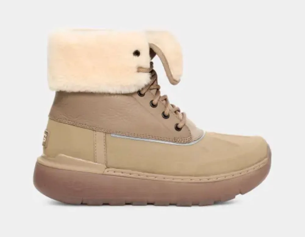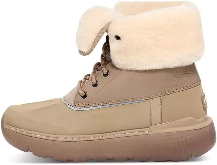 Водонепроницаемые свойства с герметичными швами Водонепроницаемая кожа и язычок с боковыми вставками с водоотталкивающим покрытием Подкладка из 8 мм пушистой полиакриловой ткани на части голенища, подкладка из 8 мм пушистой полиакриловой ткани на передней части, подкладка из 10 мм UGGplush из 80% переработанной шерсти и 20% лиоцелла или подкладка из 10 мм UGGplush из 60% переработанной шерсти и 40% лиоцелла Межподошва из ЭВА и резиновая подошва Рекомендуется для холодной погоды до -20˚C