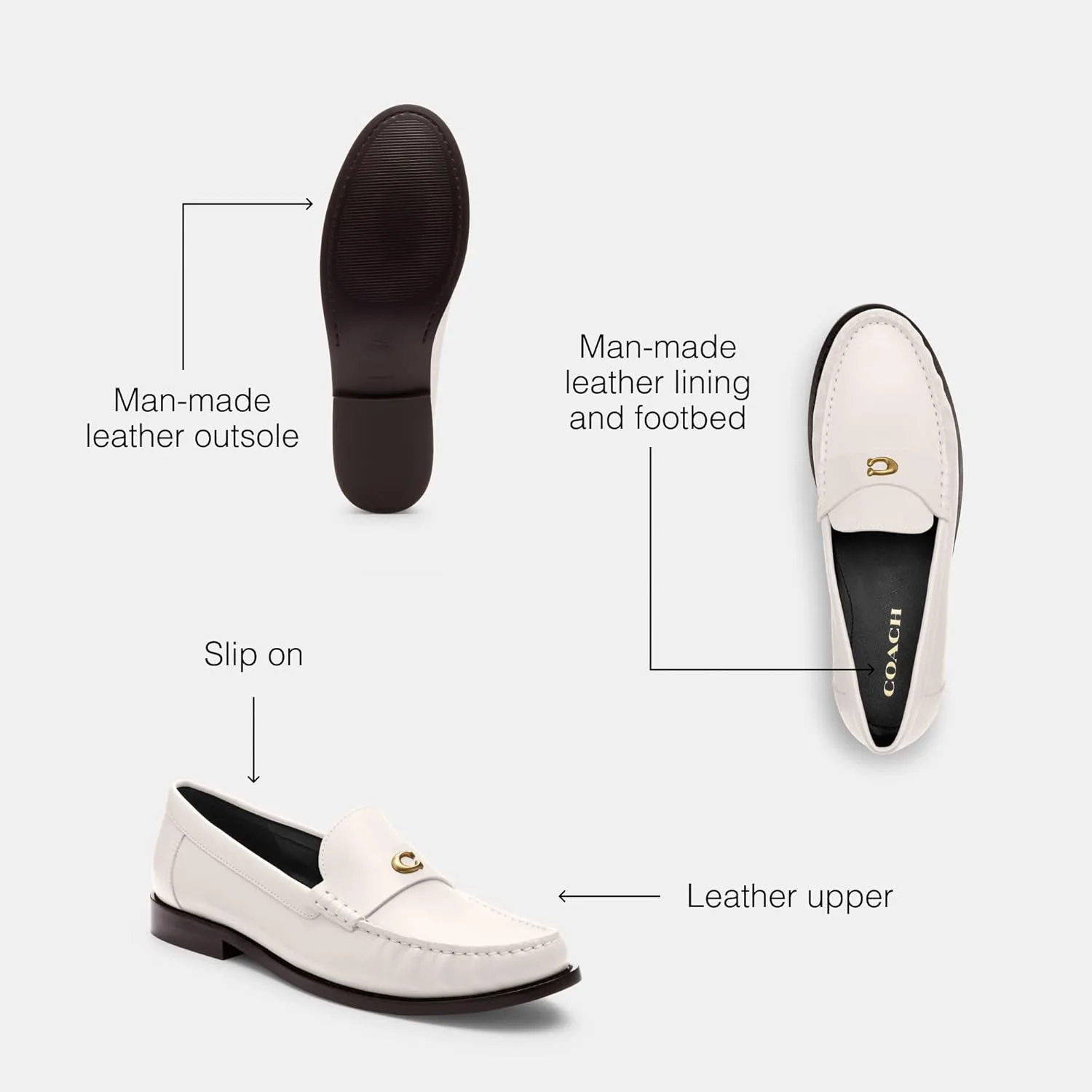 От офиса до ужина - ходите куда угодно в изысканном стиле в кожаных лоферах COACH Jocelyn. Эти обувь без шнурков выполнена из гладкой кожи с круглым носком, украшена фирменной фурнитурой на верхе и имеет низкий блок-каблук. Подкладка и стелька из искусственной кожи. Резиновая подошва.