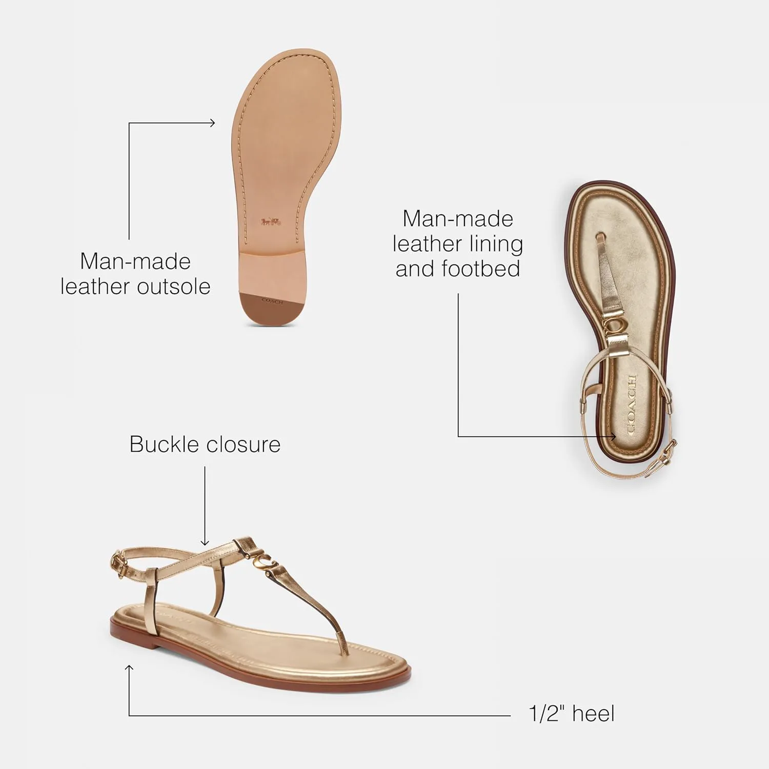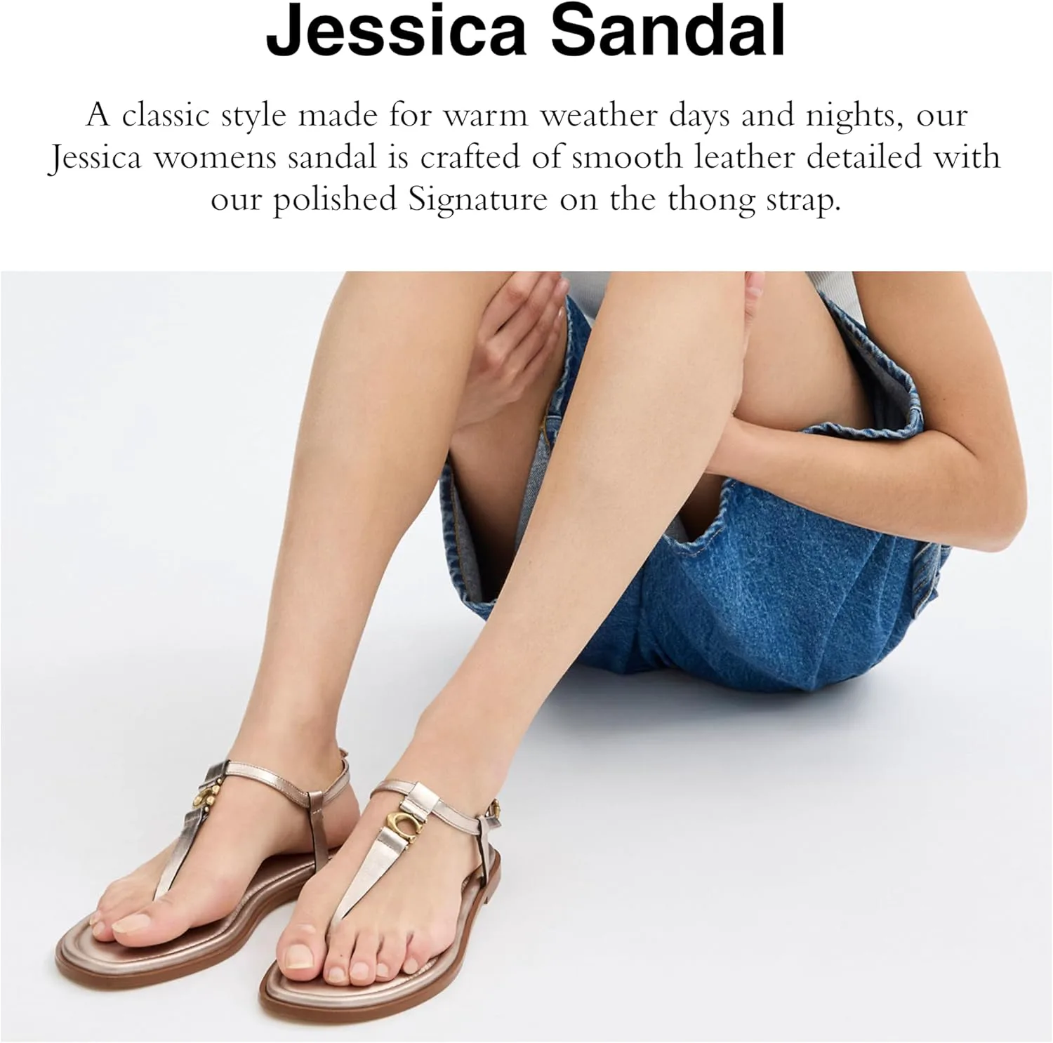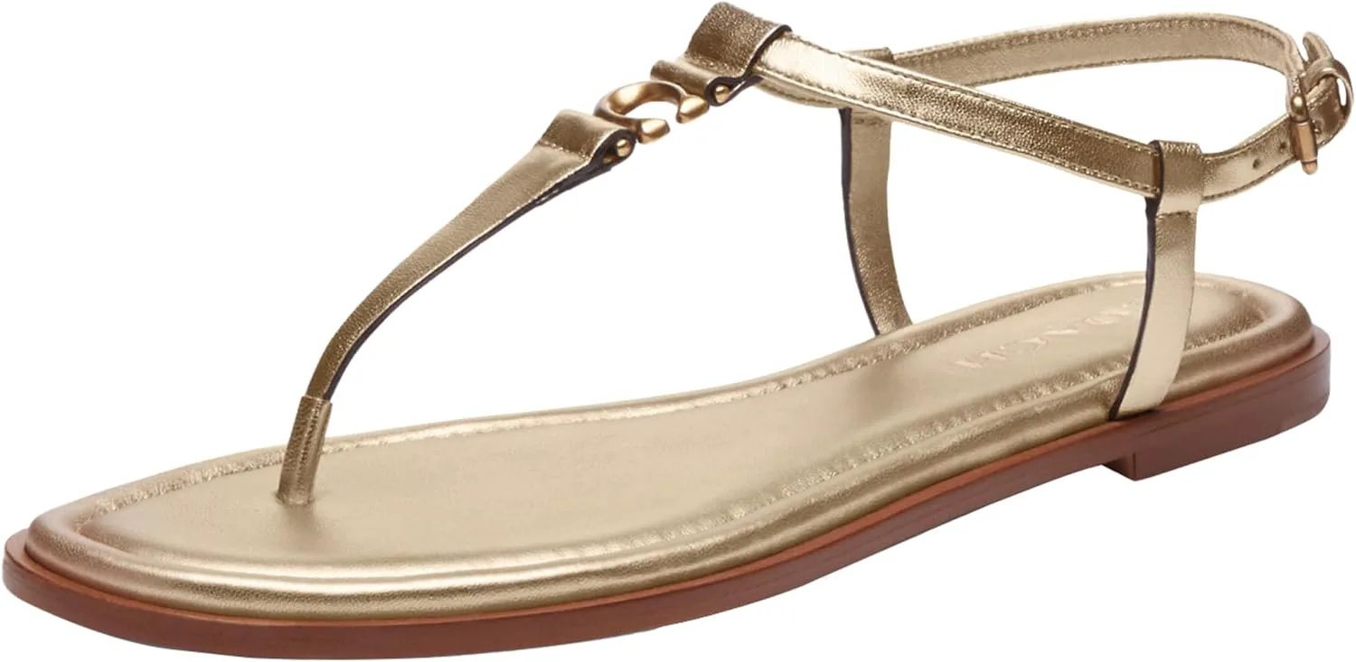 Step out in style wearing the COACH Jessica Sandals. Made with metallic leather upper and leather lining, these sandals are as chic as they are comfortable. The man-made leather footbed ensures a plush feel with each step, while the signature brand l