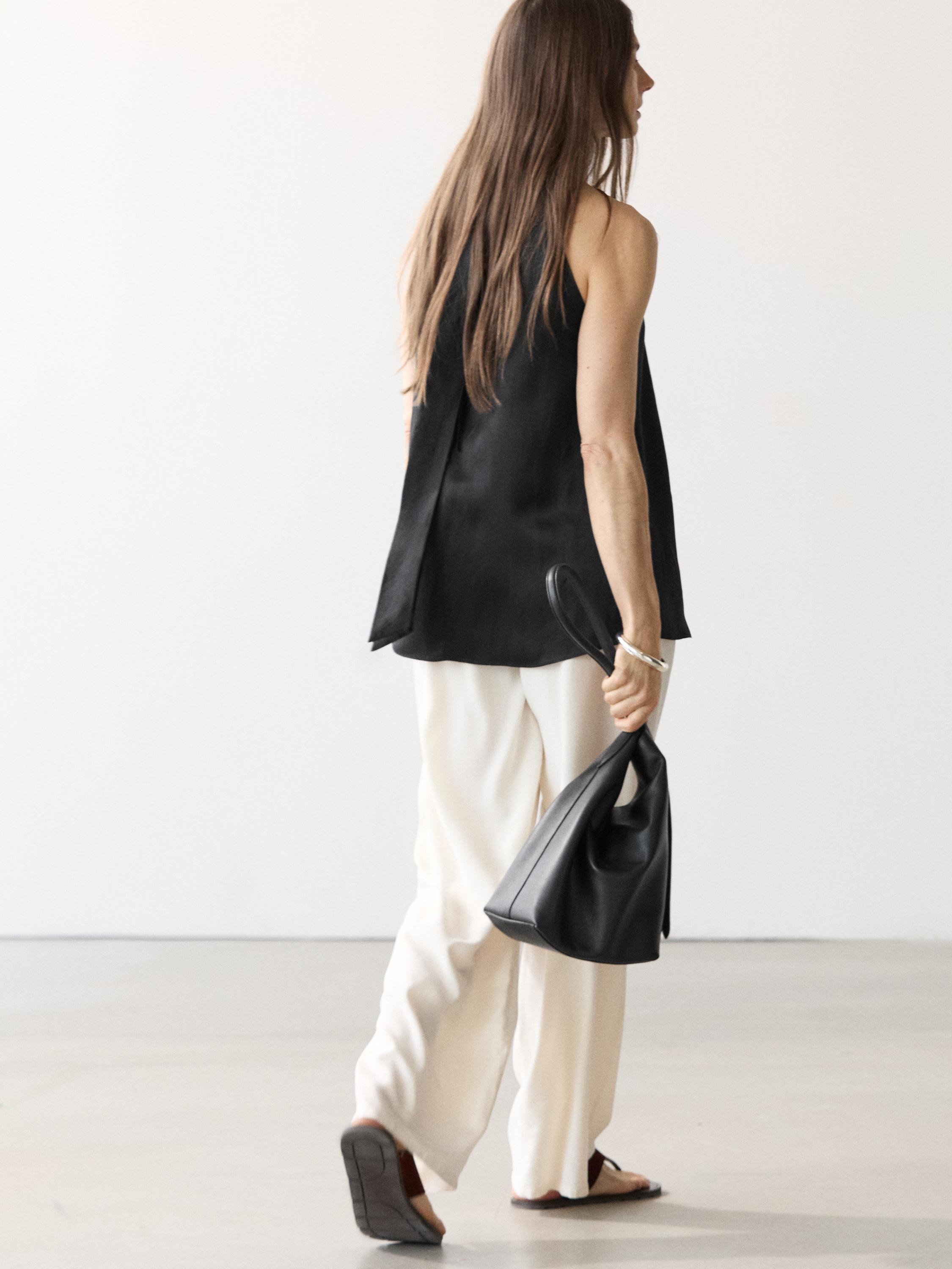 Добавьте безупречный стиль в любой образ с этим топом Massimo Dutti, созданным из струящегося сатина с благородным блеском. Модель отличается изысканным дизайном и продуманной функциональностью, где каждая деталь подчеркивает безупречный вкус владельца. Элегантные бретели-халтер с завязкой на шее придают модели узнаваемый штрих испанского бренда, сохраняя при этом женственную элегантность.