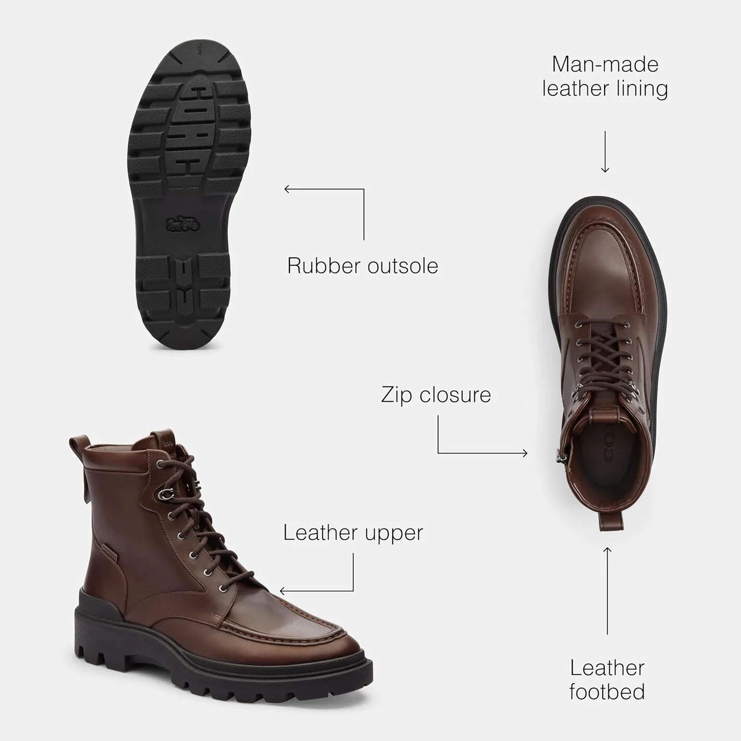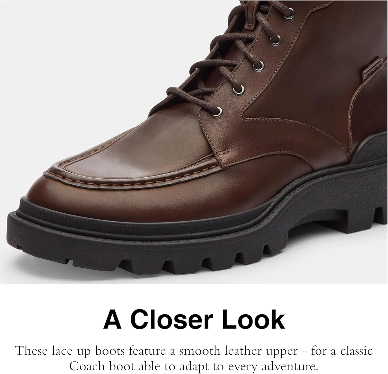 Наши мужские ботинки Connor - прочные и стильные, представляющие собой усовершенствованную, но крайне надежную версию армейских ботинок - носите их как для торжественных случаев, так и каждый день. Эти мужские ботинки на шнуровке имеют гладкий кожаный верх - классические мужские ботинки Coach, готовые к любым приключениям.