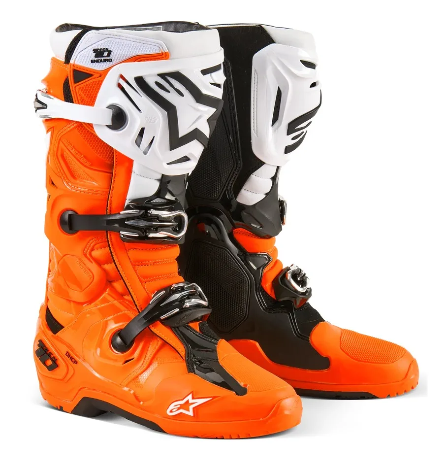 Сертифицированные CE ботинки Tech 10 Enduro. Ботинок оснащен собственной специальной двойной составной подошвой, соответствующей спецификации Enduro, которая легко интегрирована в структуру основания стопы с разной плотностью и имеет встроенную поддержку, обеспечивающую превосходную долговечность, сцепление и ощущение во время езды, а также улучшенную производительность при переключении передач. Дизайн Tech 10 Enduro улучшает общую функциональность; производительность и безопасность при одновременном уменьшении веса и уменьшении объема материала. Ключевой инновационной особенностью Tech 10 Enduro является запатентованная рама управления фронтальным изгибом. В сочетании с двойными передними и задними ножевыми разъемами рама действует как амортизатор, распределяя энергию по раме багажника, одновременно контролируя изгиб вперед и назад. Это дает ботинкам Tech 10 Enduro полную и плавную систему контроля сгибания, от корпуса стопы до голени, обеспечивая высокоэффективный двойной контроль движений, предотвращая чрезмерное сжатие и чрезмерное растяжение. Tech 10 Enduro оснащен системой управления лодыжкой Alpinestars, которая интегрирована во внешнюю оболочку и обеспечивает естественное движение лодыжки, контроль вертикального сжатия, а также улучшенный контроль гибкости и ударопрочность. Это дополняется внутренним фиксатором лодыжки и уникальной инновационной защитой пятки; запатентованная система Dynamic Heel Compression Protector (DCHP). Это значительно снижает эффект чрезмерной, потенциально опасной для травмы, энергии, передаваемой на лодыжку и голень.